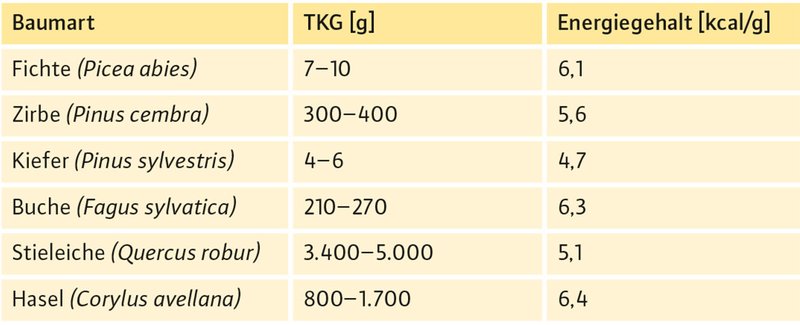 Im Energiegehalt sind die Samen der Nadelbaumarten pro Gewichtseinheit durchaus mit Haselnüssen und Eicheln vergleichbar (Abb. 2). Die großen Samen der Zirbe sind daher für Tierarten wie beispielsweise Eichhörnchen, Fichtenkreuzschnabel und den Tannenhäher von großem Interesse. Ja selbst der Mensch nutzt die Zirbelnüsse zur Ernährung.