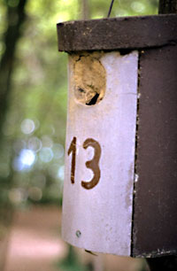 Abb. 2: Der Kleiber "kleibert" den Eingang eines Hohltaubenkastens auf sein gewünschtes Maß zu. (Foto: Th. Ullrich)