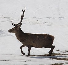 Abb. 6 – Ein stattlicher Hirsch auf Nahrungssuche im Winter. Foto: Ulrich Wasem (WSL)