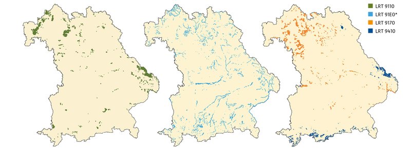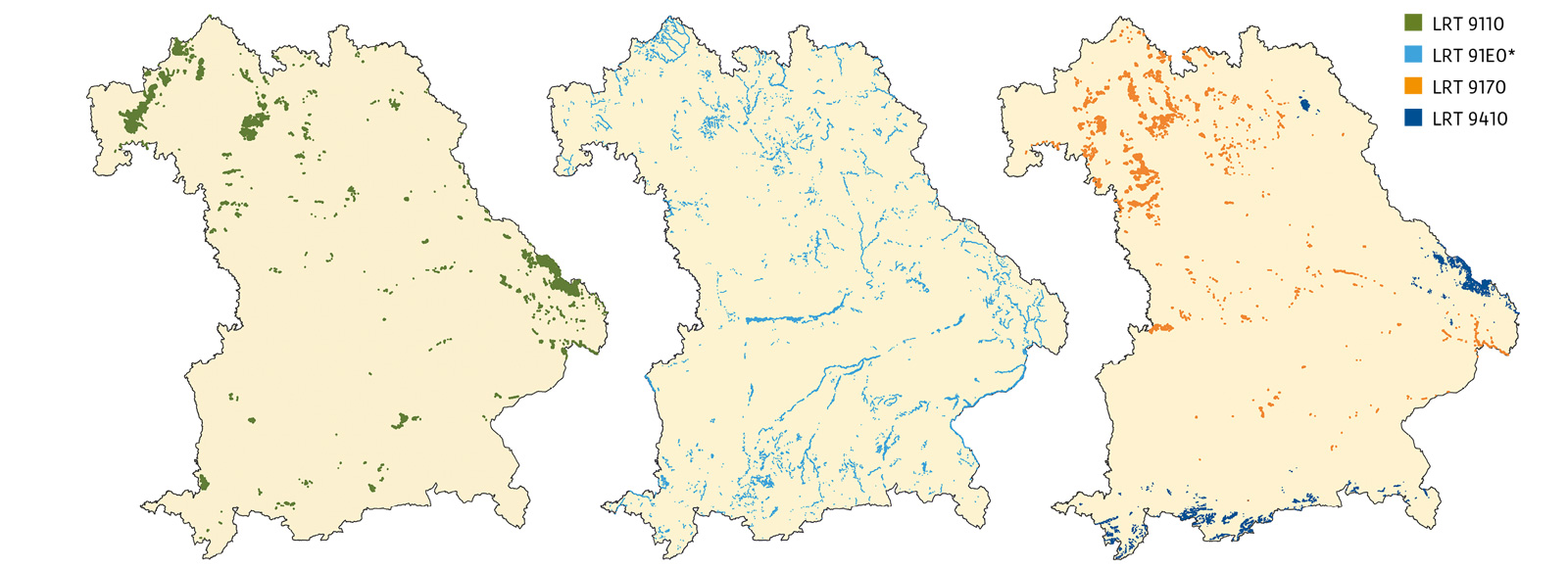 Naturgemäß sind die Lebensraumtypen nicht gleichmäßig über ganz Bayern verteilt (Abbildung 7). So kommt der LRT 9170 schwerpunktmäßig auf der Fränkischen Platte und der LRT 9410 in den Hochlagen der Bayerischen Alpen vor.