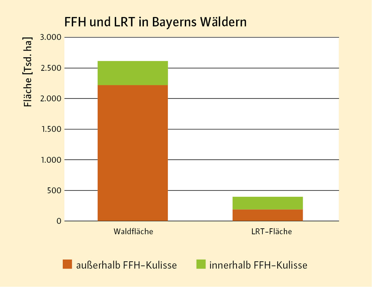Bayerns Beitrag zum ökologischen Netz Natura 2000, dem weltweit größten Schutzgebietssystem, besteht neben Vogelschutzgebieten im Wesentlichen aus 674 Fauna-Flora-Habitat-Gebieten. In diesen FFH-Gebieten sind bestimmte Lebensräume und Arten gemäß der Fauna-Flora-Habitat-Richtlinie (FFH-RL) an die EU gemeldet und somit europäisch geschützt. Die FFH-Gebiete umfassen eine Fläche von circa 6.460 km², was etwa 9 % der Landesfläche entspricht. Der Waldanteil innerhalb der FFH-Gebiete liegt bei knapp 60 %, das sind in etwa 387.000 ha (Abbildung 1). Der Großteil der naturschutzfachlich wertvollsten Flächen Bayerns sind also Wälder.
