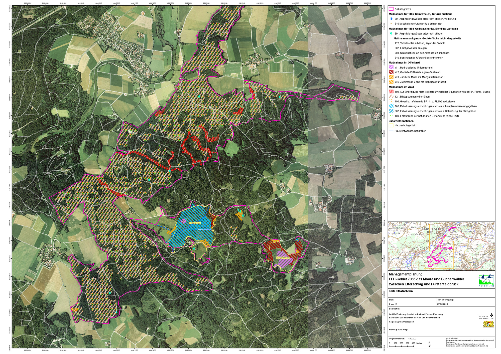 Abb. 2 und 3: Beispiele aus dem Kartenmaterial eines Managementplans. Links: Bestand und Bewertung u.a. der Lebensraumtypen; rechts: durchzuführende Maßnahmen (Quelle: LWF).