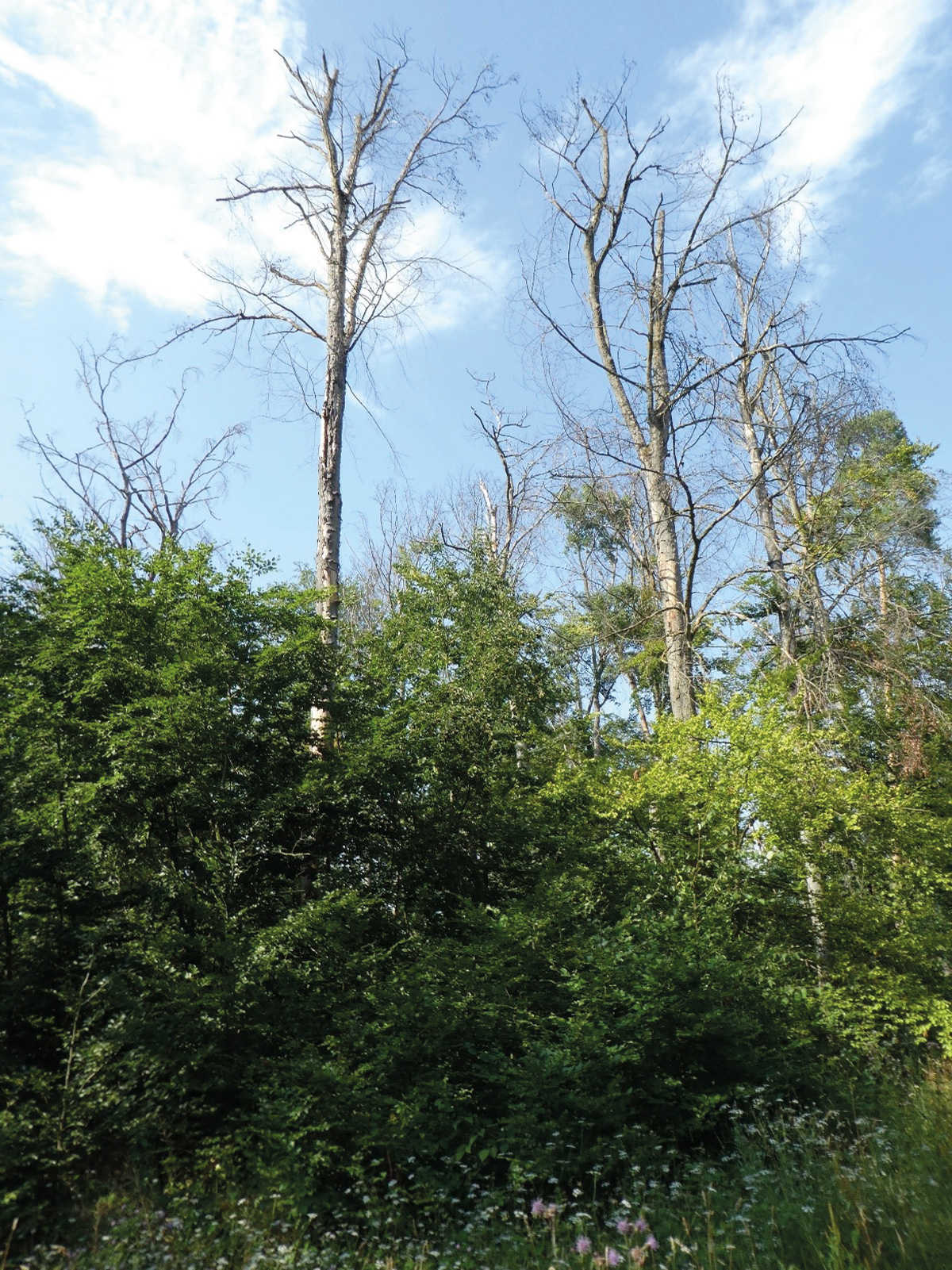 Als die FFH-Richtlinie 1992 verabschiedet wurde, spielte der Klimawandel im Wald noch eine untergeordnete Rolle. Dies hat sich drastisch geändert. Modellierungen mit verschiedenen Klimaszenarien zeigen, dass die potenziell natürliche Vegetation (pnV), die in weiten Teilen den Lebensraumtypen entspricht, sich auch schon bei "milden" Klimaszenarien teils drastisch verändern kann. Entsprachen manche Lebensraumtypen bei der Erstellung der Standarddatenbögen noch der pnV, werden sie dies in Zukunft auf einigen Standorten nicht mehr tun, sondern sich langsam zu anderen Waldtypen hinentwickeln. Hinweise hierauf könnten beispielsweise die zum Teil flächigen Trockenschäden in Buchenwäldern sein (Abbildung 9). Es stellt sich daher die Frage, was passiert, wenn diese Absterbe-Prozesse sich derart ausweiten, dass dadurch Lebensraumtypen-Fläche verloren geht.