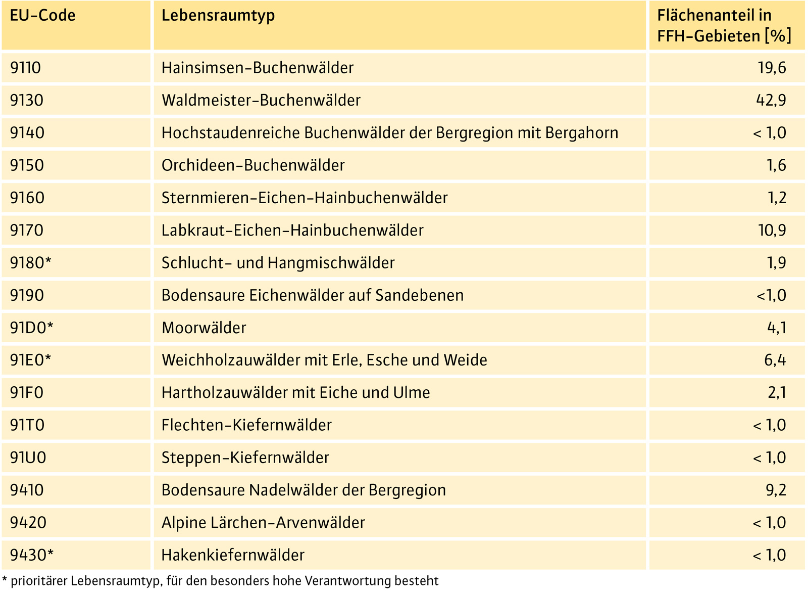 In der FFH-RL sind 231 Lebensraumtypen, darunter 81 Wald-Lebensraumtypen, aufgeführt. Sie repräsentieren typisch europäische Landschaften vom Riff bis hin zum Gletscher. In Bayern kommen 63 dieser Lebensraumtypen vor, darunter 16 Wald-LRT. Die Wald-LRT Bayerns beinhalten auch mehrere Buchen-Waldgesellschaften, für deren Erhalt wir global gesehen große Verantwortung tragen, da die Buche nur in Europa vorkommt. Darüber hinaus sind viele weitere, natürliche Waldgesellschaften europäisch geschützt. Allen Wald-LRT ist dabei gemeinsam, dass sie charakteristische Arten beheimaten, für die diese Wälder die lebensnotwendigen Schlüsselstrukturen bereitstellen. Die Unterschutzstellung der Lebensräume kommt somit den dort charakteristischen Arten zugute und ist in besonderem Maße geeignet, die biologische Vielfalt zu erhalten und zu fördern. Alle in Bayern vorkommenden Lebensraumtypen sind im gemeinsam von Umwelt- und Forstverwaltung erstellten "Handbuch der Lebensraumtypen nach Anhang I der Fauna-Flora-Habitat-Richtlinie in Bayern" beschrieben. Dieses "Handbuch" ist zugleich die verbindliche Kartier-Anleitung zur Ausscheidung von Lebensraumtypen in Bayern.