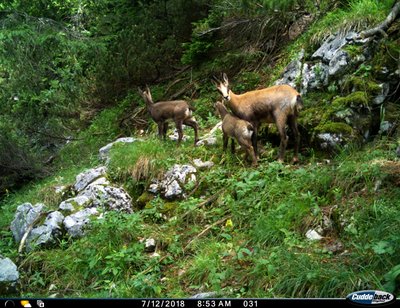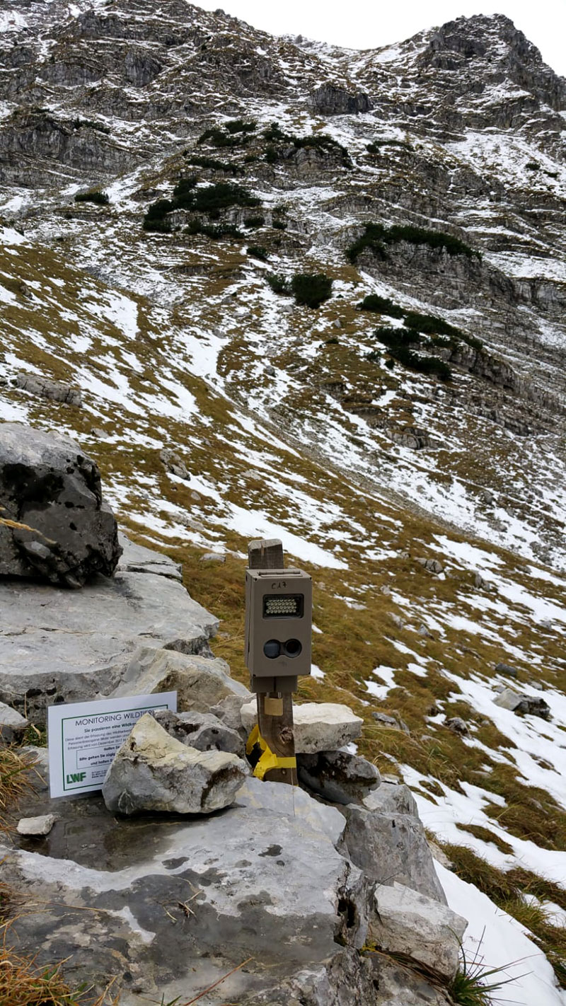Das Forschungsvorhaben wird in zwei Studiengebieten, im Bereich des Vorkarwendels und des Geigelsteins bzw. der Kampenwand, umgesetzt. Dabei kommen neben ganz traditionellen Methoden, wie der direkten Zählung, auch moderne und neue Untersuchungsverfahren aus dem Bereich der Wildtiergenetik, der Satellitentelemetrie oder des Monitorings mittels Wildtierkameras (Abb. 1 und 2) zum Einsatz. Innovativ ist vor allem das gewählte Vorgehen, alle drei für den Bergwald relevanten Schalenwildarten gleichzeitig und mit denselben Methoden zu erfassen. Auf diese Weise ist es möglich, Wechselbeziehungen zwischen den verschiedenen Schalenwildarten und ihrem Lebensraum aufzuzeigen und zu analysieren.