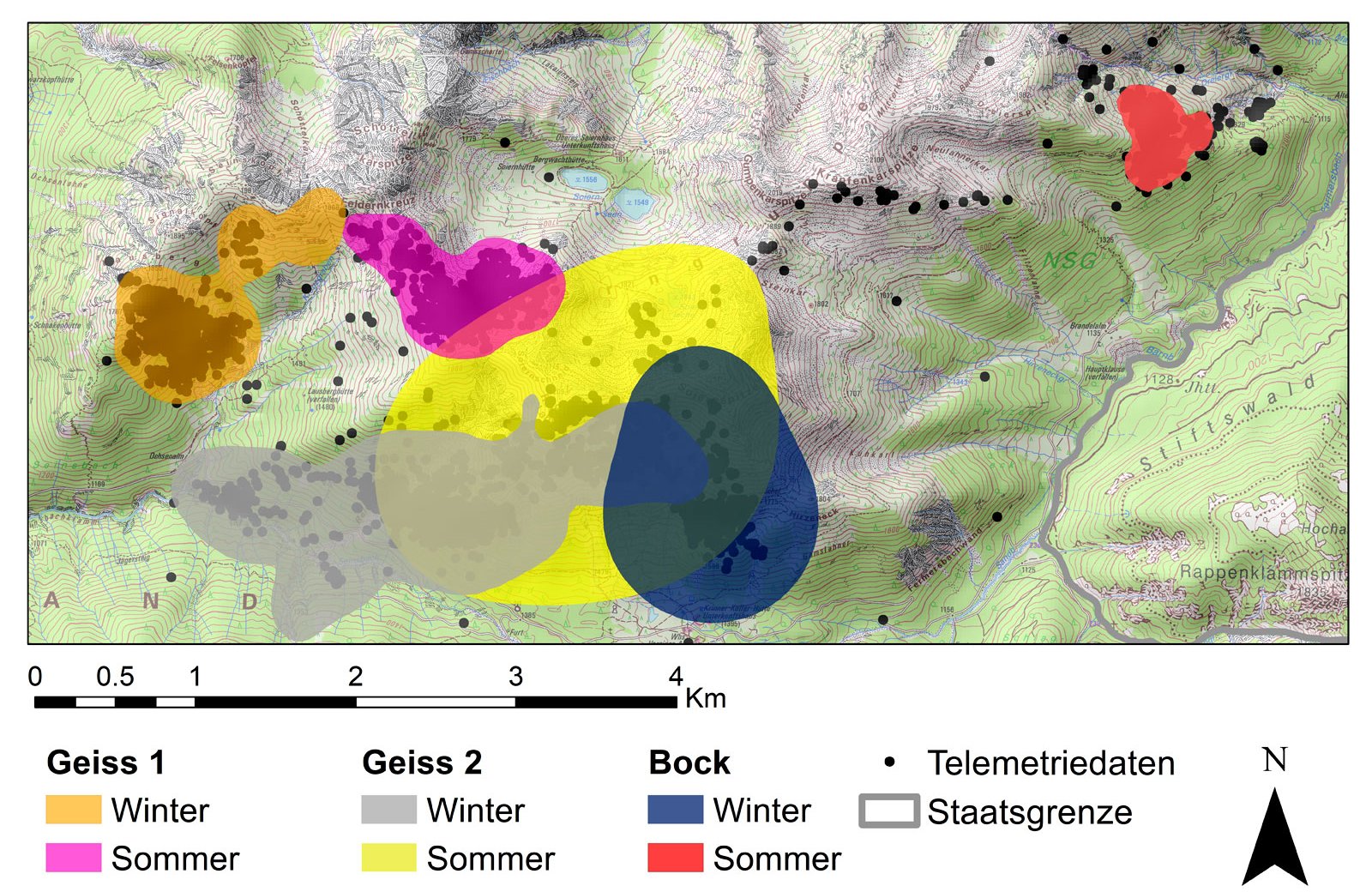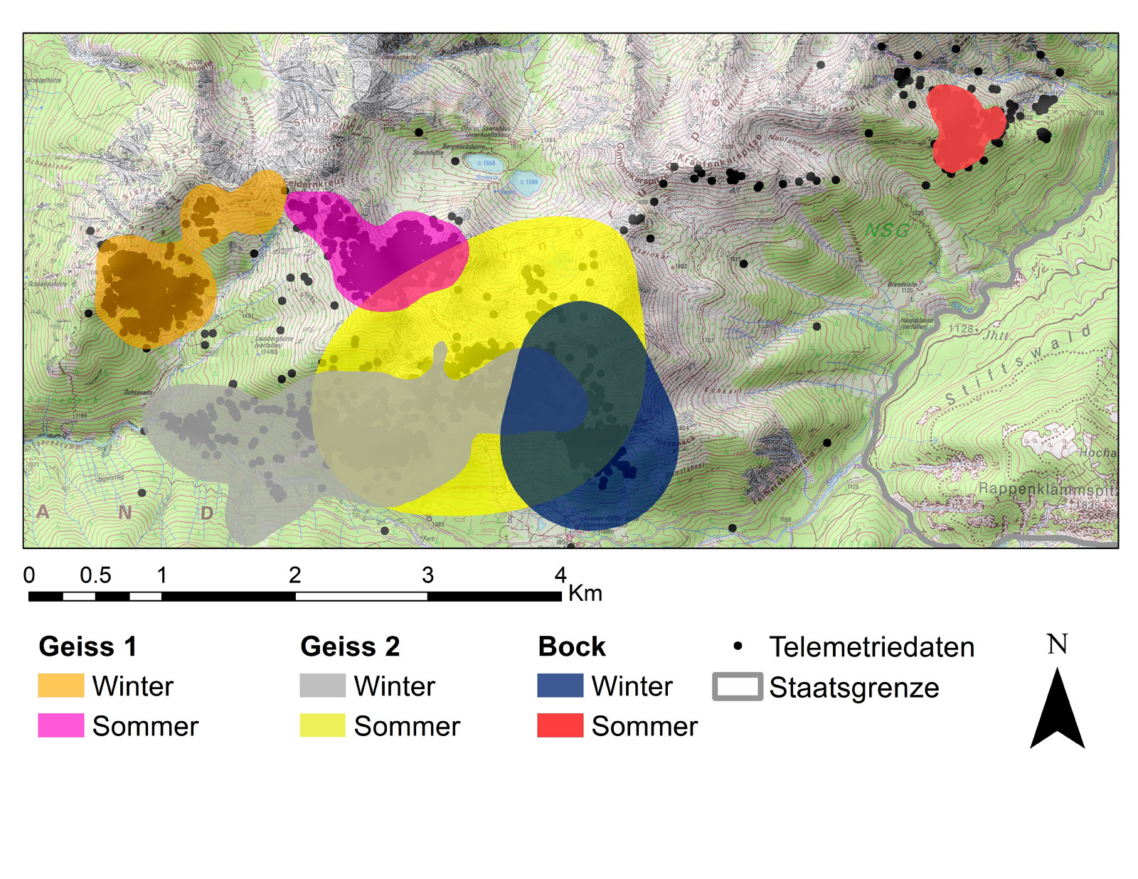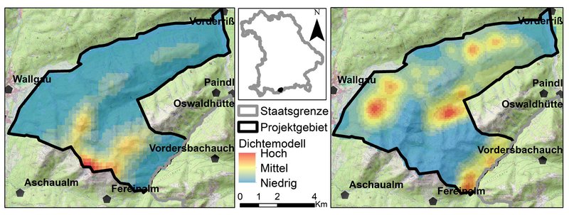 Für den Frühsommer im Projektgebiet "Karwendel" ergab die Untersuchung der Lebensraumnutzung der drei Schalenwildarten auch deutliche Unterschiede hinsichtlich der bevorzugten Lebensraumeigenschaften. Dabei zeigte sich, dass Gämsen steiles und schroffes Gelände bevorzugen, während die Rothirsche eher ebeneres Gelände mit sanften Steigungen im Wald oder in Waldnähe aufsuchen. Das Reh präferierte Lebensräume mit hoher Deckung in niedrigeren Lagen. Im Vergleich zur Gams war die Lebensraumeignung bei Rotwild und Reh stärker durch die Verfügbarkeit von Vegetation, wie einem hohen Verjüngungsanteil der Waldvegetation, geprägt. In Hinblick auf menschliche Störungen war auffällig, dass Gämsen den geringsten Abstand zu Wanderwegen von allen drei Schalenwildarten einhielten, während Rothirsche Wanderwege am stärksten mieden. Diese Ergebnisse liefern unter anderem wichtige Erkenntnisse zum Einfluss der menschlichen Aktivitäten auf die Lebensweise der Schalenwildarten und stellen damit wichtige Bausteine für ein integrales Wildtiermanagement dar.