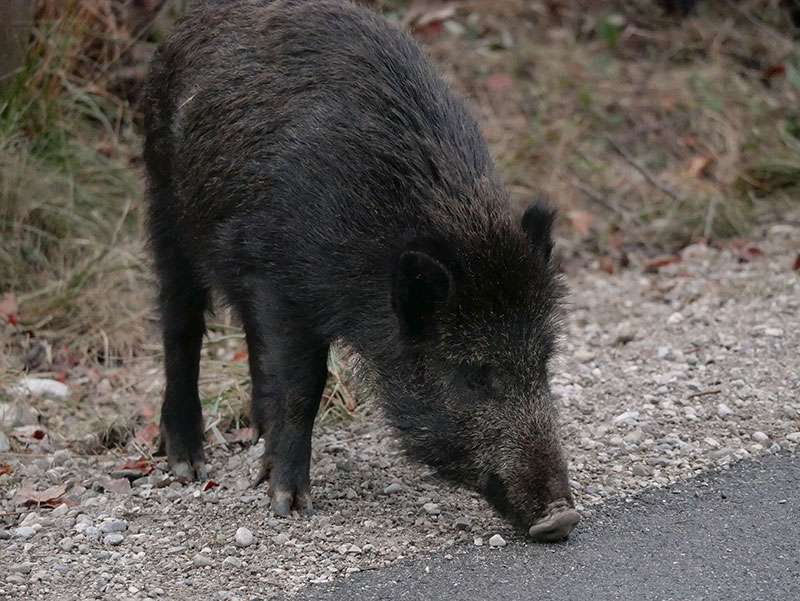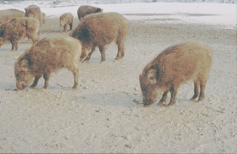 Abb. 2: Dagegen zeigen bei dieser Wildschweinrotte im Schaugatter in einer nicht artgerechten Haltung die Jungtiere ein eher kränkliches Aussehen.