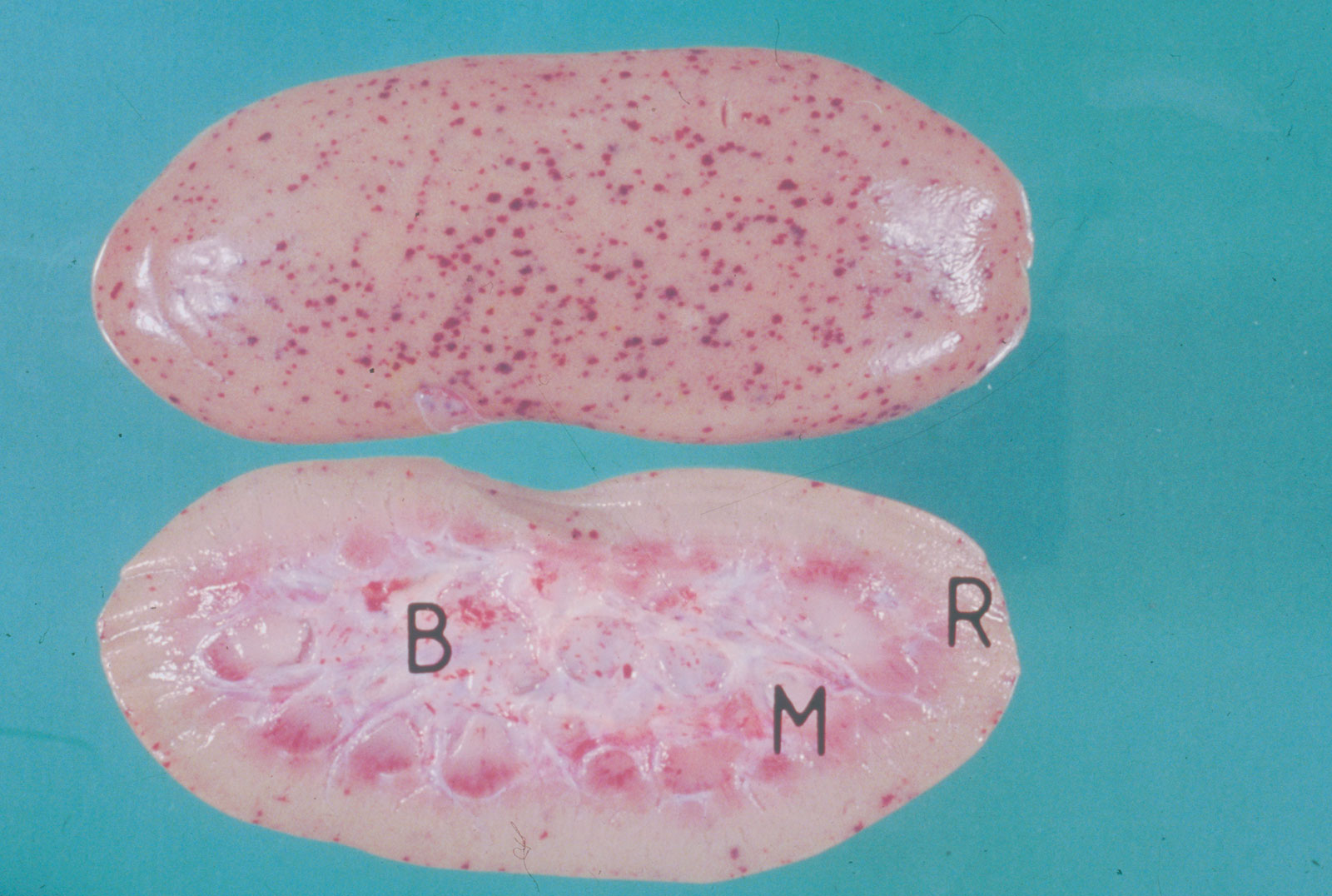 In Deutschland kommt bei Haus- und Wildschweinbeständen die Europäische Schweinepest vor. Sie wird durch ein Virus verursacht. Infektionsquellen sind Fleischprodukte, Schlacht- und Küchenabfälle. Der Aufnahme infizierten Materials folgt eine fieberhafte Erkrankung, in deren Verlauf vor allem Frischlinge und Überläufer abkommen und verenden. Bei älteren Tieren entwickelt sich eher eine chronische Form. Die Erscheinungen sind vielfältig: Appetitmangel, Abmagerung, Schwäche, Zittern, Bewegungsstörungen, Krämpfe, Durchfall, Nasenbluten, struppiges Haarkleid, bei trächtigen Bachen Früh- oder Totgeburten. Beim Aufbrechen sind an nahezu allen Organen Blutungen (Abb. 4) und blutrote bis rot-schwarze Lymphknoten charakteristisch.