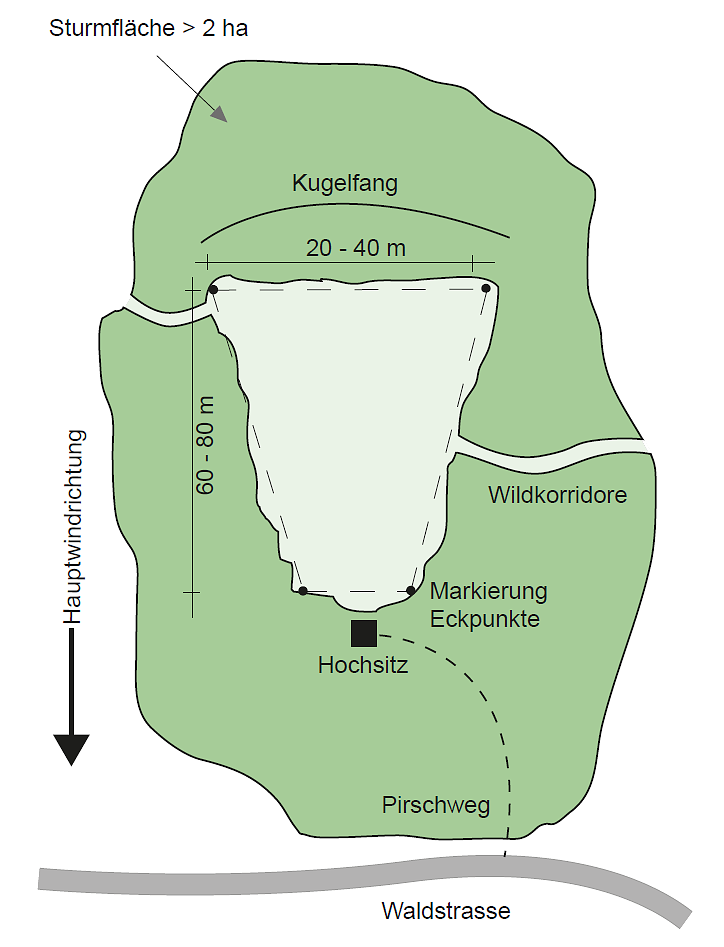 Die Grösse und For der Fläche sowie einzelne stehen gelassene Bäume beeinflussen den Lichteinfall und damit die Zusammensetzung der Krautschicht. Kleine Strukturelemente, die als Deckungsmöglichkeit Sicherheit vermitteln, sind wichtig für die Akzeptanz der Freihalteflächen durch das Reh.