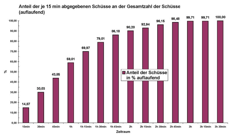 Abb. 2: Abgegebene Schüsse (auflaufend) in 15-Minuten-Intervallen