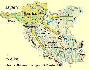 Abb. 2: Einwanderungskorridore des Goldschakals aus Kroatien, Slowenien und Ungarn nach Österreich (nach A. Willer, Quelle: National Geographik Deutschland).