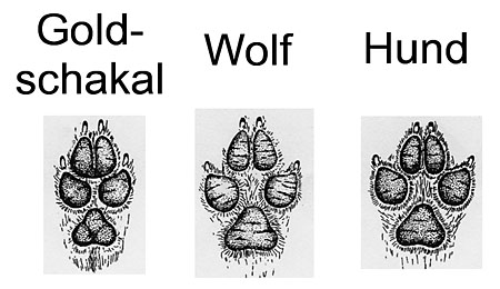 Abb. 3: Spuren der Vorderextremitäten von Goldschakal, Wolf und Hund; die Verschmelzung der vorderen Zehenballen gelten als typisches Merkmal für den Schakal.