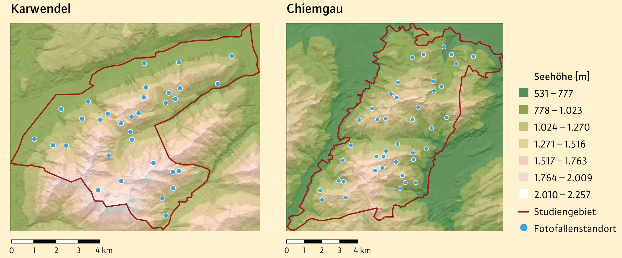 Die beiden Untersuchungsgebiete Karwendel und Chiemgau liegen im bayerischen Alpenraum und spiegeln die dort typischen Lebensräume wider – vom Bergwald über offene Landschaften wie Almen und alpine Rasen bis hin zu felsigen Hochlagen (Abbildung 2). Zwischen dem 1. Juli 2018 und dem 31. Oktober 2020 wurden in beiden Gebieten insgesamt 73 Wildkameras installiert (32 im Karwendel, 41 im Chiemgau). Die Standorte der Kameras wurden mithilfe des Generalized-Random-Tesselation-Stratified-Algorithmus (GRTS) zufällig über die Untersuchungsflächen verteilt, um eine möglichst gleichmäßige und repräsentative Beprobung sicherzustellen. Zum Einsatz kamen Wildkameras des Typs Cuddeback Modell C mit Infrarotblitz. Diese wurden in einer Höhe von 50 bis 70 cm über dem Boden montiert und so konfiguriert, dass bei jeder Auslösung automatisch drei Bilder aufgenommen wurden.