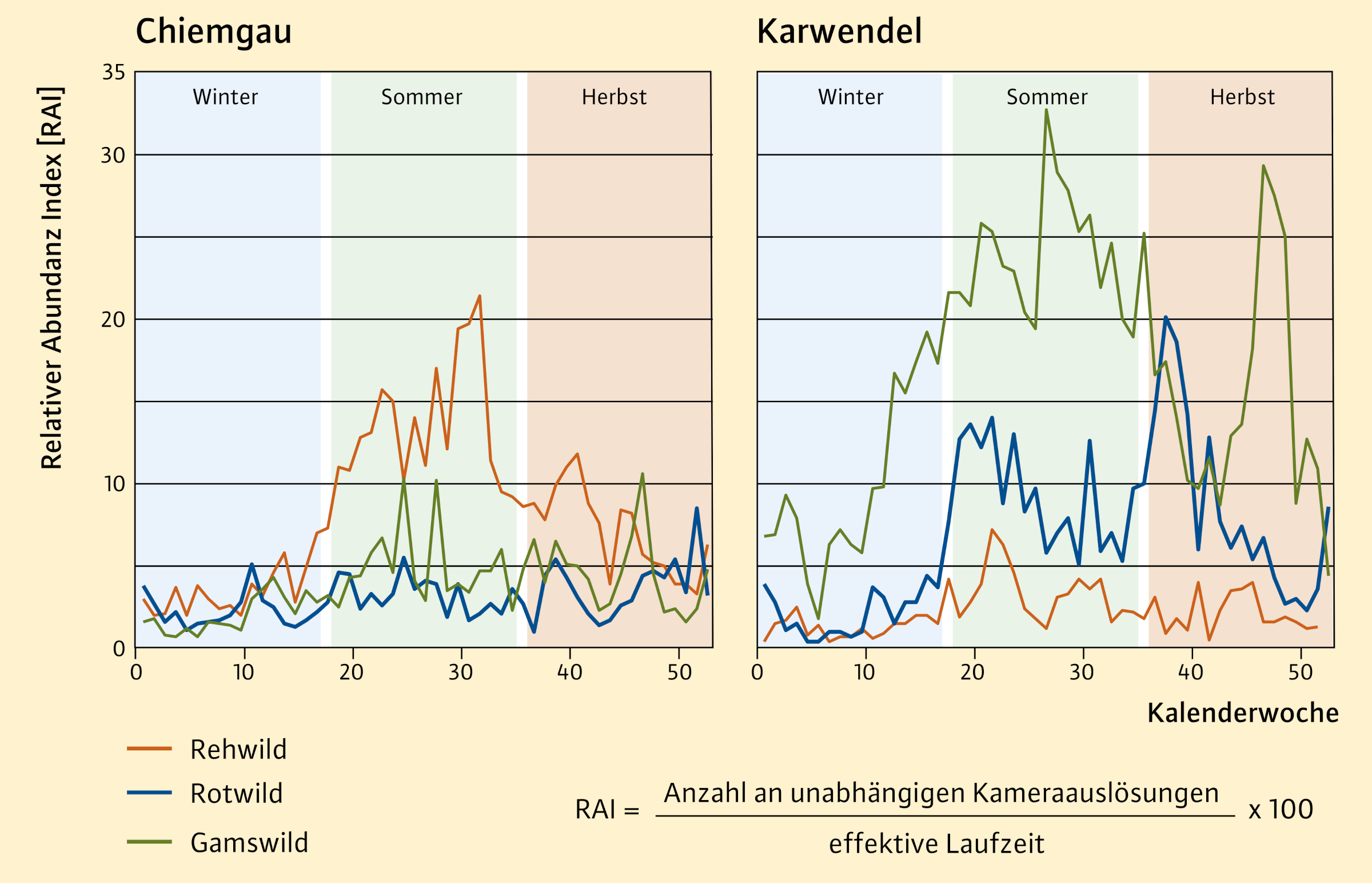 Wird der RAI für ein Gesamtgebiet über einen längeren Zeitraum an allen Fotofallenstandorten betrachtet, repräsentiert er die relativen Unterschiede in der Häufigkeit verschiedener Wildarten. Im Karwendel war die häufigste Wildart das Gamswild (durchschnittlich 17,3 Ereignisse pro 100 Kameratage), gefolgt vom Rotwild (7 Ereignisse pro 100 Tage) und Rehwild (2,2 Ereignisse pro 100 Tage). Umgekehrt verhielt es sich im Chiemgau, wo das Rehwild fast neun Ereignisse pro 100 Tage Kameralaufzeit generierte. Gamswild folgte mit vier Ereignissen und Rotwild mit drei Ereignissen pro 100 Tage Kameralaufzeit.