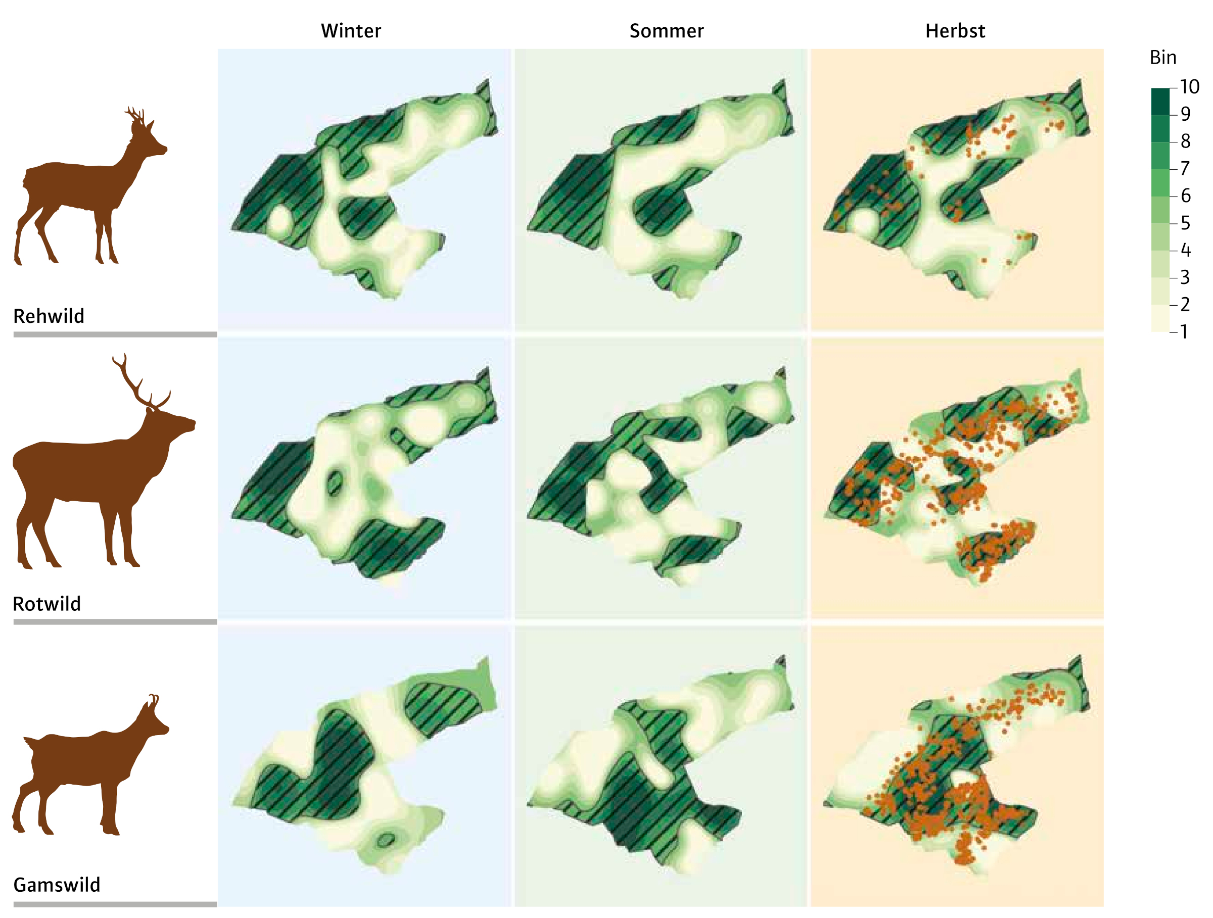 Je nach Lebensraumausstattung und Witterung kann sich der Zeitpunkt, an dem sich Aktivität und Raumnutzung von Wildarten mit unterschiedlichen ökologischen Bedürfnissen im Jahresverlauf verändern, ebenfalls unterscheiden. Ein umfassendes Verständnis dieser Zusammenhänge stellt eine wichtige Grundlage für das Wildtiermanagement dar. Beispielsweise könnte die Kenntnis des Zeitpunkts, zu welchem die Tiere ihre Winterlebensräume aufsuchen, ein wichtiger Baustein für die Ableitung von zukunftsorientierten, effektiven Managementstrategien sein.