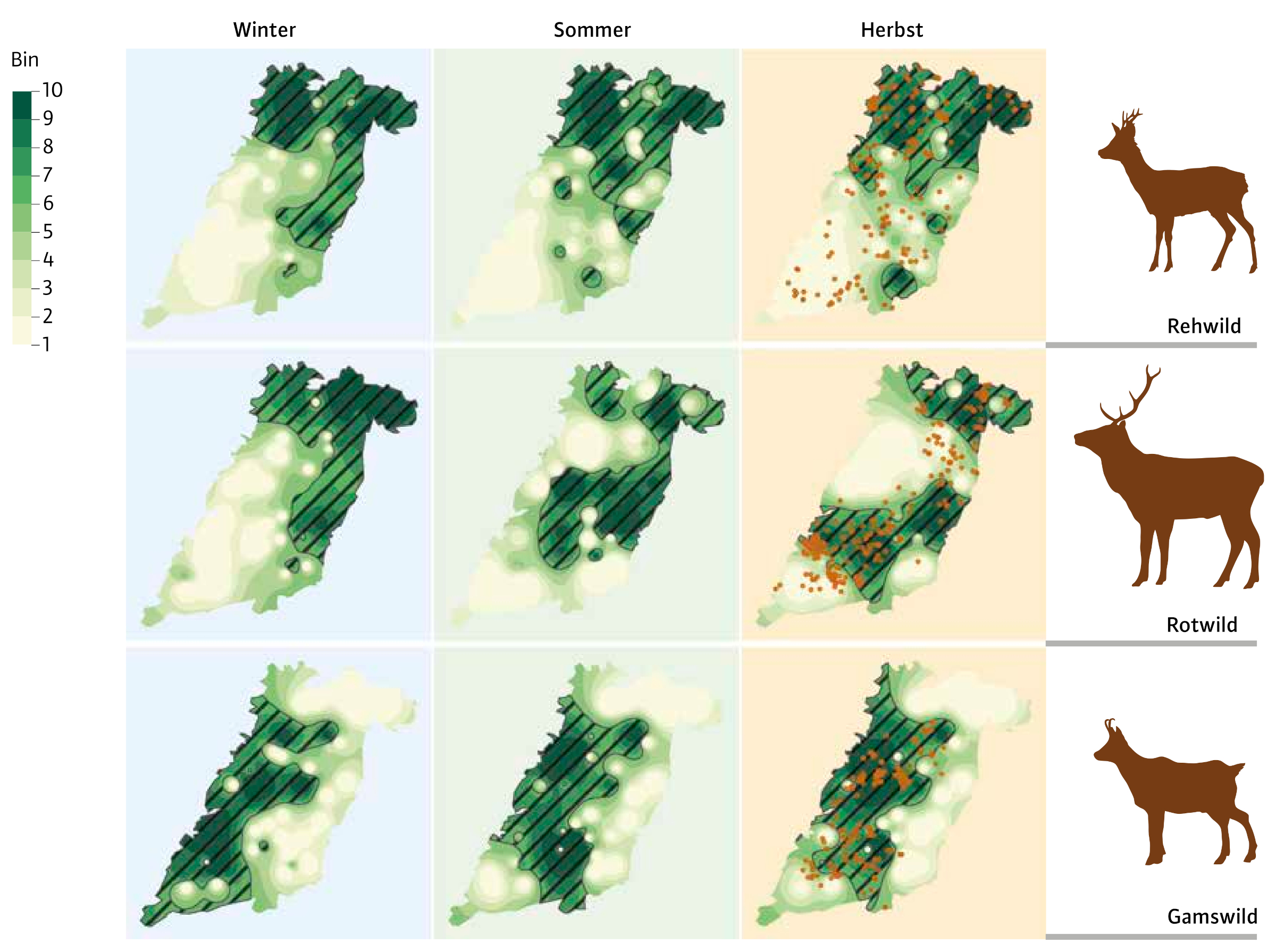 Bei der Interpretation der Ergebnisse und Daten ist darüber hinaus zu berücksichtigen, dass sich die Wildarten nicht nur innerhalb der beprobten Gebiete umverteilen, sondern auch ab- und zuwandern können. Auch ist die räumliche Projizierung stark von den Standorten der Fotofallen und deren effektiven Laufzeiten abhängig. Liegen zum Beispiel Kameras im Winter unter dem Schnee, liefern sie keine räumliche Information zur Wildverteilung in dem Zeitraum und können daher bei der flächigen Vorhersage keine Information beitragen. Tiefergehende Analysen sollten zukünftig auch den Einfluss verschiedener Umweltfaktoren (sowohl natürliche als auch anthropogene Faktoren) auf die Erfassungswahrscheinlichkeit sowie Raumnutzung der Wildarten betrachten und damit zu einem besseren Verständnis über die ökologischen Prozesse, die den saisonalen Veränderungen zu Grunde liegen, beitragen.
