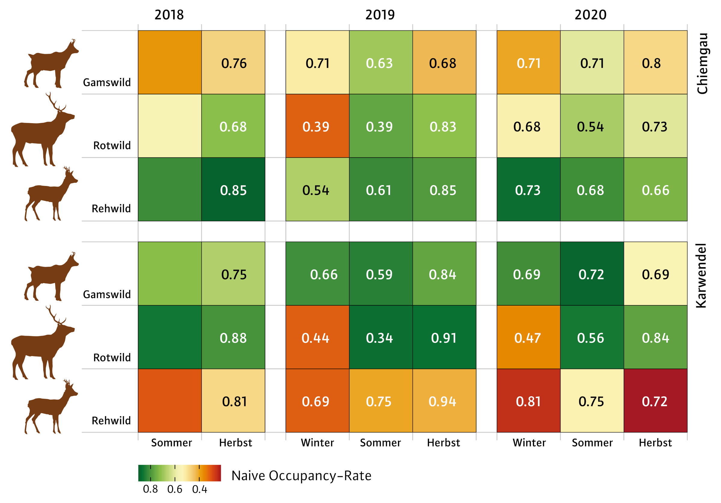 Während des Untersuchungszeitraums war im Chiemgau das Rehwild an 22 % der Fotofallenstandorte in allen drei Saisons präsent. Das Gamswild war an 12 % der Standorte dauerhaft sichtbar, während das Rotwild nur an 7 % der Standorte konstant beobachtet wurde. Bei allen drei Wildarten zeigte sich also eine Nutzungsänderung an über zwei Dritteln der Standorte im Jahresverlauf: Rehwild an 76 %, Rotwild an 83 % und Gamswild an 66 %. Die verbleibenden Standorte wurden über alle Jahreszeiten hinweg von der jeweiligen Wildart gar nicht genutzt. Im Karwendel waren Reh- und Rotwild nur an 9 % der Fotofallenstandorte kontinuierlich präsent, Gamswild hingegen an 15 % der Standorte. Innerhalb der saisonalen Abschnitte im Untersuchungszeitraum änderte sich die Nutzung an 53 % der Standorte bei Rehwild, an 81 % bei Rotwild und an 78 % bei Gamswild, wobei die übrigen Standorte über alle Jahreszeiten hinweg dauerhaft ungenutzt blieben.