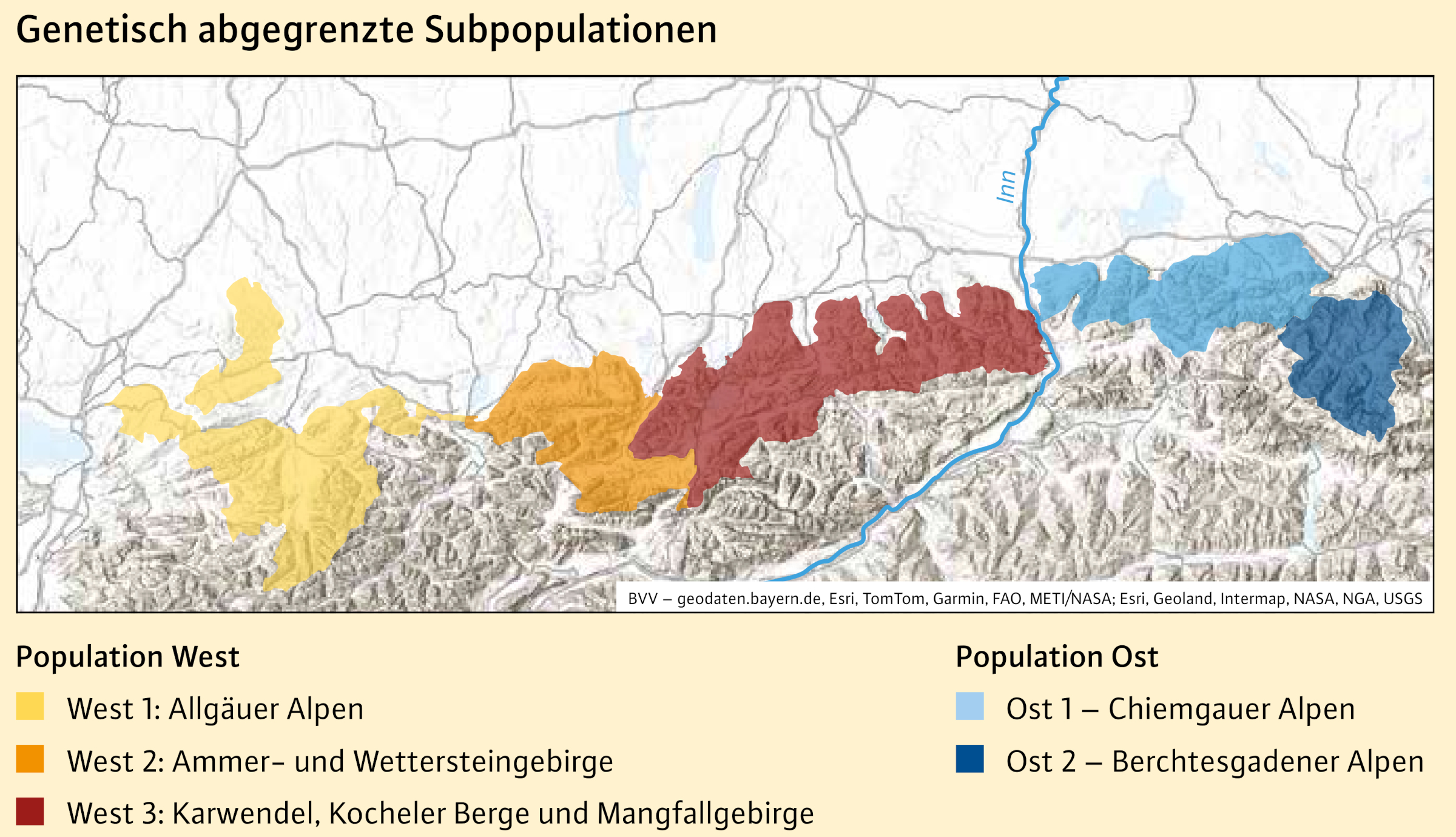 Abb. 4: Genetische Populationsstruktur der Gämsen im bayerischen Alpenraum. In der Darstellung sind die beprobten Naturräume/Naturraumeinheiten den jeweiligen genetischen Populationen zugeordnet. Die Gamsvorkommen lassen sich im Wesentlichen in eine Population westlich und eine östlich des Inns – hier als blaue Linie dargestellt - unterteilen. Innerhalb dieser Populationen konnten Subpopulationen abgegrenzt werden, die jedoch weniger stark voneinander abgetrennt waren.