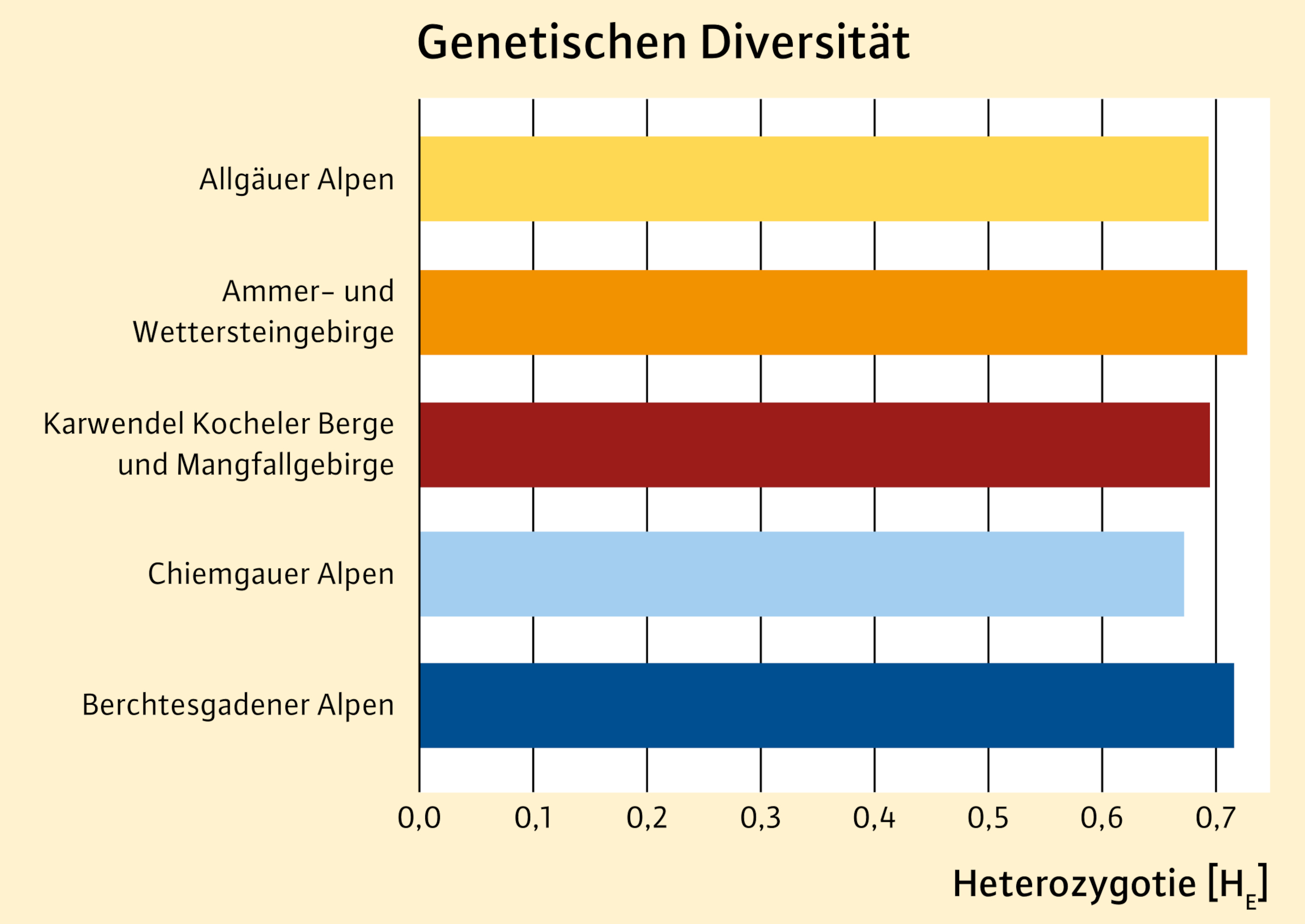 Eine zentrale Fragestellung des Projekts war der genetische Zustand der bayerischen Gamspopulationen: Wie hoch ist die genetische Vielfalt der Gämsen in Bayern, gibt es Unterschiede zwischen den Regionen? Zur Beantwortung dieser Frage wurden für die abgegrenzten Subpopulationen verschiedene Parameter berechnet, die die genetische Vielfalt abbilden. Einer dieser Parameter ist der Heterozygotiegrad: dieser kann Werte zwischen 0 und 1 annehmen und gibt den Anteil an Individuen an, die für ein Merkmal mischerbig sind. Mischerbige Individuen haben an einem untersuchten Genort zwei unterschiedliche Ausprägungen eines Merkmals, sie haben also von ihren Elternteilen unterschiedliche Varianten geerbt. Gemittelt über eine Population oder Subpopulation gibt der Heterozygotiegrad Auskunft über die genetische Diversität dieser Einheiten. Für die Gämsen im bayerischen Alpenraum lag die Heterozygotie im Vergleich mit anderen Studien aus dem Alpenraum im mittleren bis hohen Bereich, zwischen den einzelnen Subpopulationen gab es aber geringfügige Unterschiede (Abbildung 5). Detaillierte Analysen zum Einfluss der Landschaft auf die genetische Diversität zeigten, dass die kleinräumige genetische Vielfalt zum Rand der Gamsvorkommen und mit abnehmenden Anteilen an für die Gams geeigneten Höhenlagen zurückgeht. Dies kann darauf zurückzuführen sein, dass in Randlagen sowohl die Populationsdichte als auch die Möglichkeiten für genetischen Austausch geringer sind. Insgesamt wurde für die bayerischen Gamsvorkommen aber ein guter genetischer Zustand mit hoher genetischer Diversität und guter Konnektivität zwischen verschiedenen Gebirgsregionen nachgewiesen.
