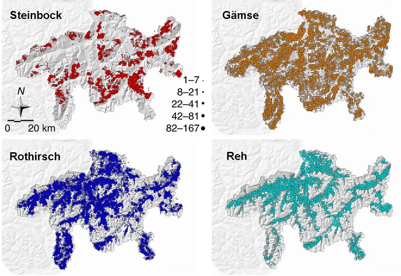 In den letzten Jahrzehnten haben Forschende zahlreiche Beispiele von Tier- und Pflanzenarten dokumentiert, die sich wegen dem Klimawandels in höhere Lagen verschieben. Dies trifft auch auf drei Huftierarten der Alpen zu, wie ein internationales Forscherteam unter Leitung der Forschungsanstalt WSL mit einem umfangreichen, weltweit einzigartigen Datensatz nachweisen konnte: Das Amt für Jagd und Fischerei Graubünden hat mehr als 230’000 Orte für Reh, Rothirsch, Gämse und Steinbock dokumentiert, an denen zwischen 1991 und 2013 in Graubünden Tiere erlegt wurden.