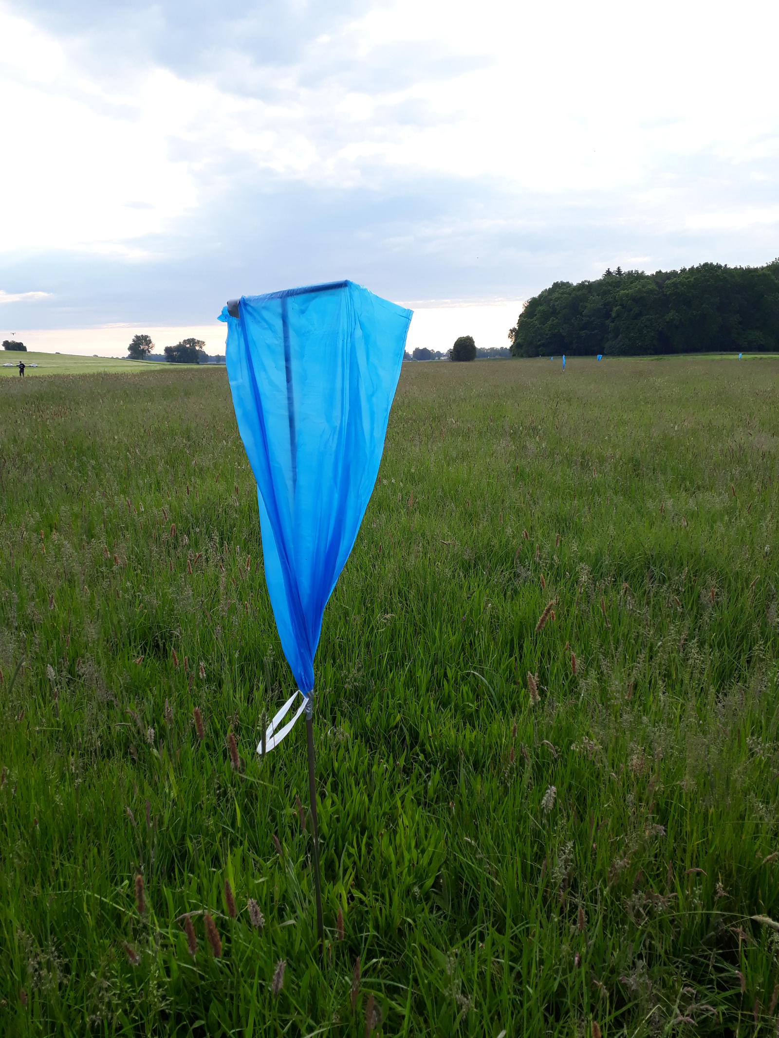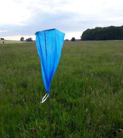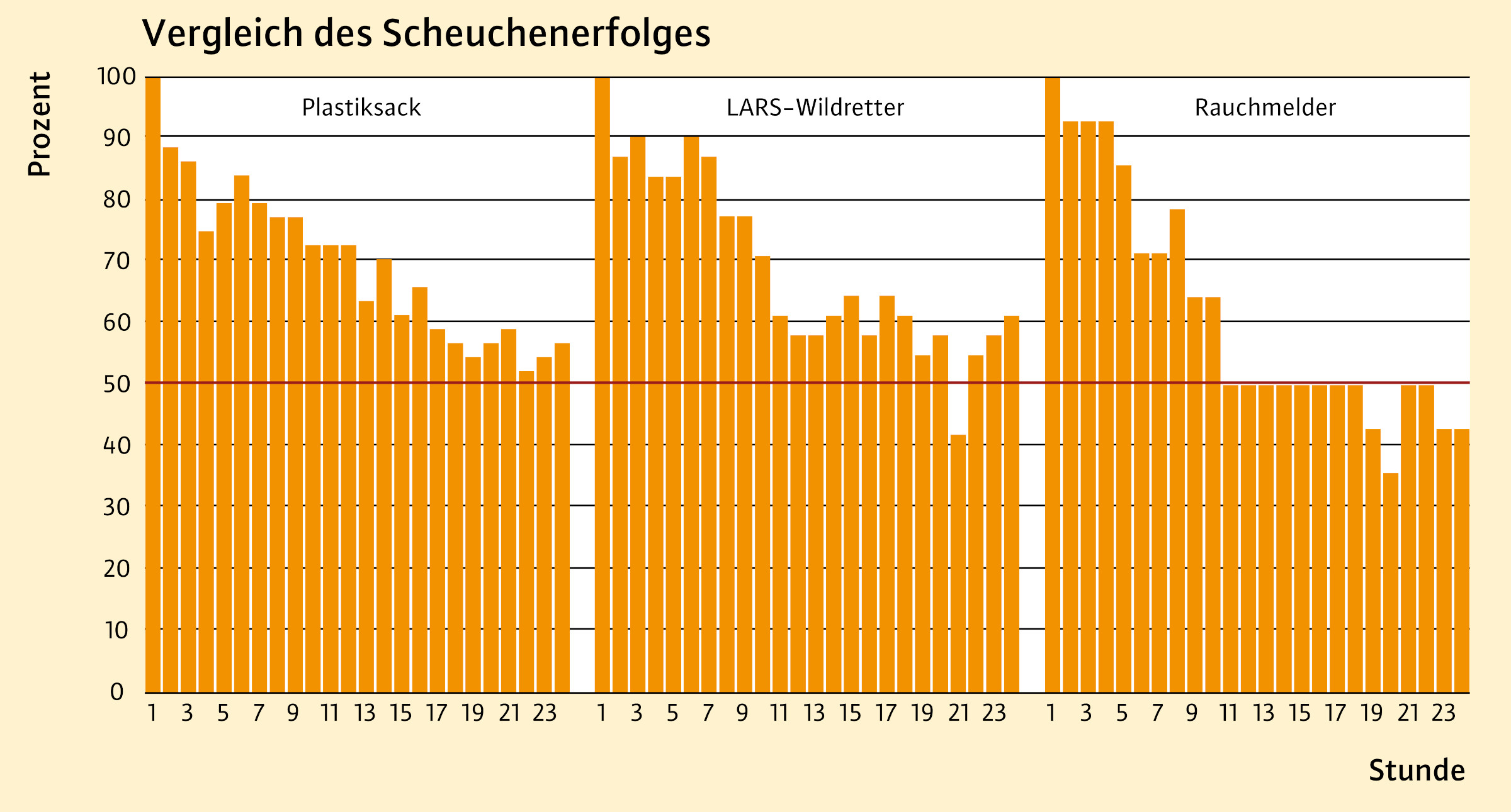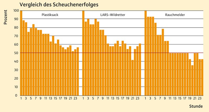 Um Rehkitze aus zu mähenden Flächen zu scheuchen, wird auch auf Wildscheuchen vertraut. In der Praxis gibt es eine Vielzahl von Wildscheuchmodellen. Um die Wirkung der Scheuchen zu untersuchen, wurden insgesamt 107 Versuche durchgeführt. Die meisten fanden auf Grünland statt, gefolgt von Getreidefeldern, Ganzpflanzensilagen und Stilllegungen/Wildäckern. Als Vergrämungsmethoden wurden über 24 Stunden "Plastiksack" (siehe Abbildung 7), “LARS-Wildretter”, “Rauchmelder” und “Heraustragen/Herausscheuchen” getestet. Insgesamt waren 36 % der Versuche erfolgreich: Hier hat das Kitz die Fläche dauerhaft verlassen. Der Plastiksack erzielte eine Erfolgsquote von 32 %, LARS-Wildretter 35 % und der Rauchmelder zeigte mit 50 % die beste Erfolgsrate. Allerdings: Die Kitze verließen häufig kurzfristig die bescheuchten Flächen, sie kehrten jedoch innerhalb der Versuchslaufzeit schon wieder zurück (Abbildung 5). 12 Stunden nach Versuchsende waren bereits 50 % der Kitze wieder auf der bescheuchten Fläche. Die Ergebnisse verdeutlichen, dass Scheuchen vor allem unterstützend eingesetzt werden können und unmittelbar vor der Mahd aufgestellt werden müssen. Das Alter der Kitze, die Vegetation oder die Anzahl der Scheuchen zeigten keinen Einfluss auf den Versuchserfolg oder den Zeitpunkt, an dem die Kitze die Versuchsfläche zum ersten Mal verließen.