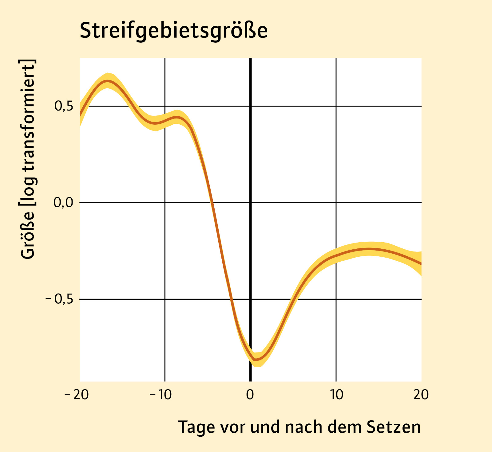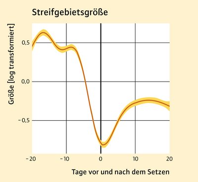 In drei Studiengebieten in Mittelfranken und Oberbayern wurden Geißen gefangen und mit Telemetriehalsbändern ausgestattet. Diese zeichneten regelmäßig GPS-Positionen auf, wodurch die Raumnutzung und das Verhalten der Geißen untersucht werden konnten. Dabei zeigten die besenderten Tiere generell – und somit auch zur Setzzeit – eine hohe Individualität in ihrem Verhalten. Dennoch konnten wir zumindest ein Muster erkennen: einige Tage vor dem Setzen bewegten sich die Geißen signifikant weniger. Zum Setzen und in den ersten Tagen danach (Bindungsphase) verkleinerten die Geißen ihr Streifgebiet um fast 70 % (Abbildung 2).