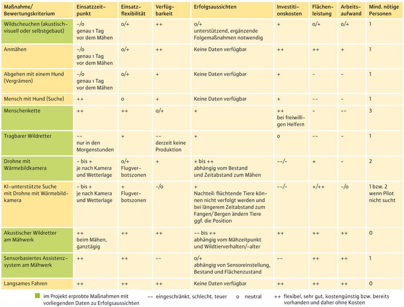 Generell gilt jedoch, dass keine Maßnahme zu einhundert Prozent den Mähtod von Wildtieren vermeiden kann. Eine Bewertung bezüglich verschiedener Kriterien erfolgt in Abbildung 8. Wichtig ist, wenn trotz aller Maßnahmen ein Rehkitz vermäht wurde, dass im näheren Umkreis (Radius ca. 50–80 m) nach weiteren Rehkitzen gesucht wird, da Rehgeißen in der Regel Zwillinge setzten und das zweite Rehkitz sich häufig in der Nähe befindet.