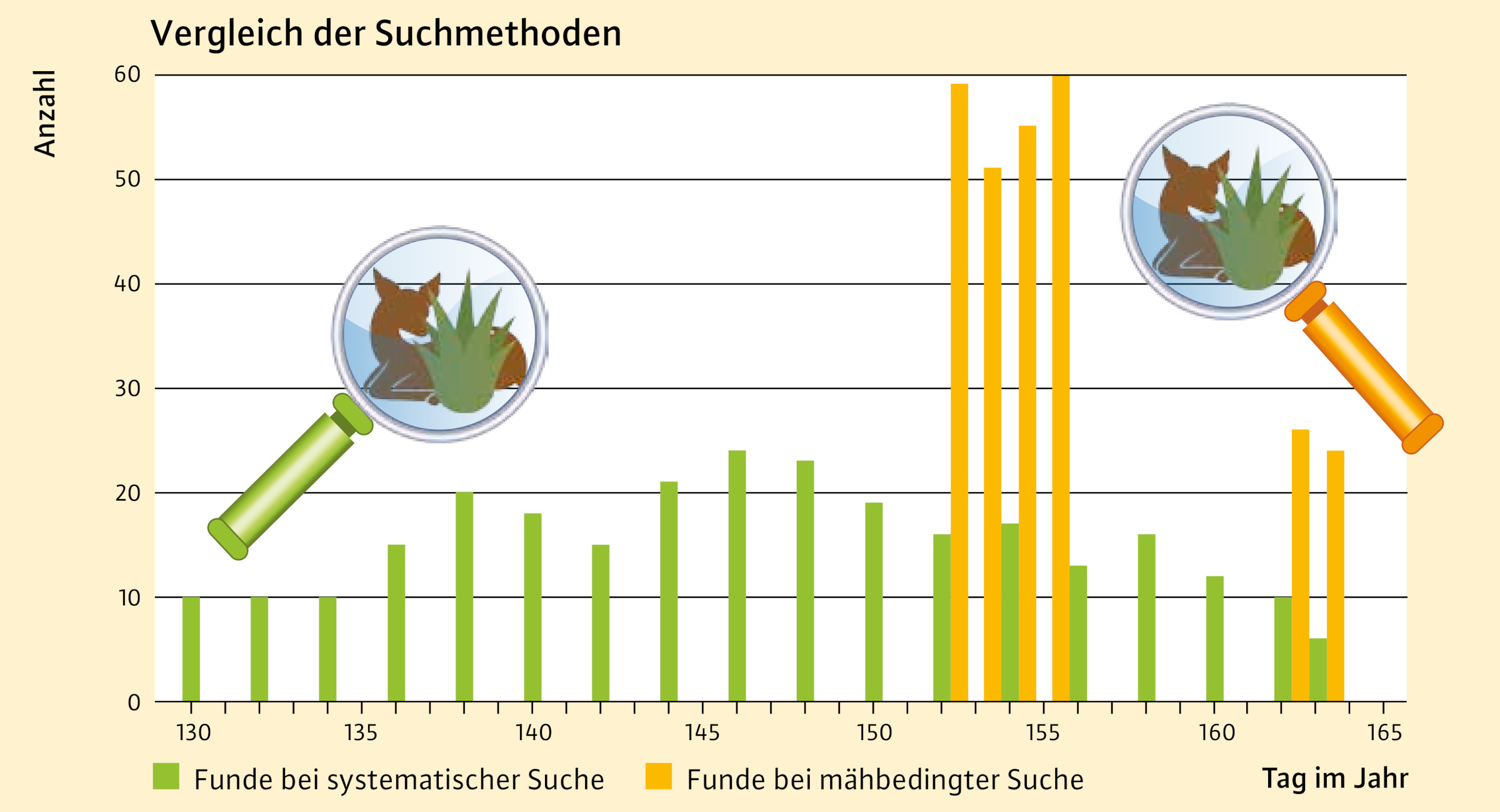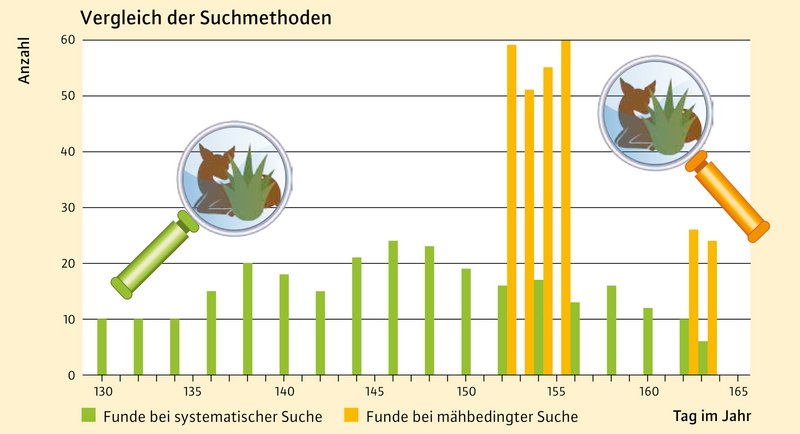 - Detektion und Vergrämung (LfL): Neben den wildbiologischen Fragestellungen wurde in diesem Teilprojekt der Einsatz technischer Hilfsmittel zur Wildtierrettung erprobt und bewertet.