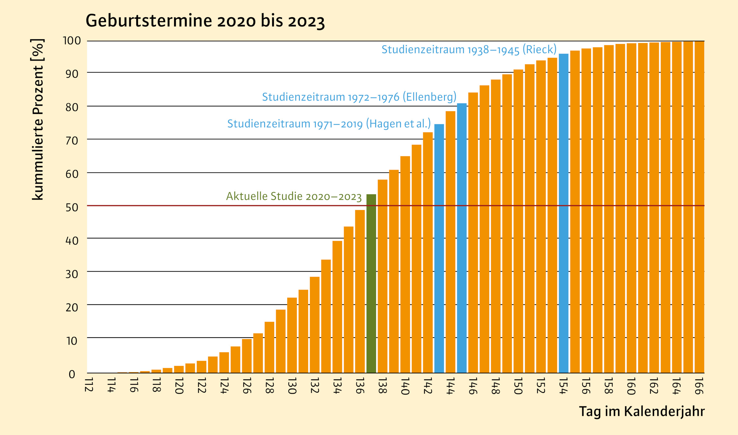Abb. 4: Kumulierte Prozentsätze der Geburtstermine 2020 bis 2023. Die rote Linie markiert die Hälfte aller Geburten (50 %). Der grüne Balken zeigt den mittleren Geburtstermin der aktuellen Studie, die blauen Balken die Termine vergleichbarer Studien in Relation zu der aktuellen Untersuchung aus Stehr et al. 2024 (in review).