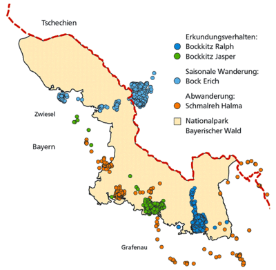 Bei den saisonalen Wanderungen legten die Tiere im Durchschnitt eine Entfernung (einfache Strecke) von zehn Kilometern zurück. Rehbock Erich z.B. verbrachte den Sommer im tschechischen Nationalpark Šumava, den Winter über hielt er sich in der Nähe von Zwiesel auf.