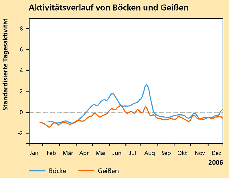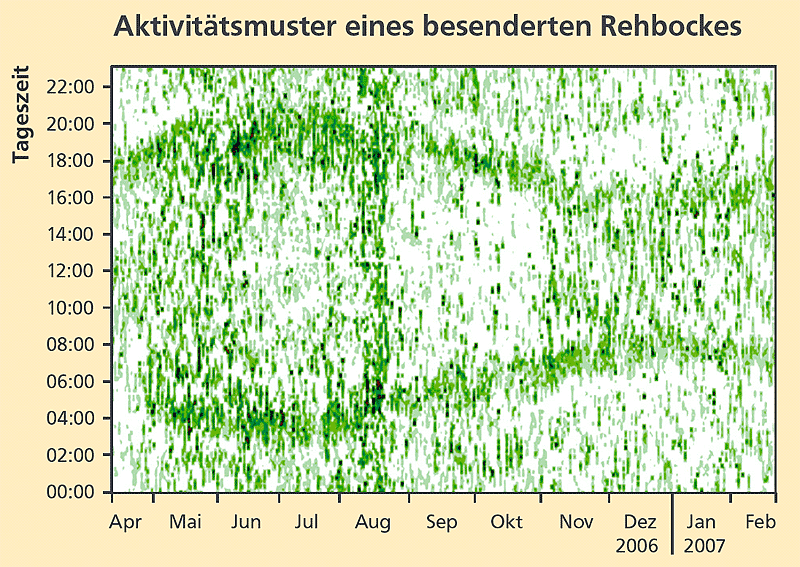 Mit Hilfe der Halsbänder war eine lückenlose Überwachung der Tiere möglich. Deren Aktivitätsschwerpunkte liegen in der Morgen- und Abenddämmerung (Abb. 3). Allerdings gibt es im Jahreslauf auch einige Ausnahmen. Im Frühling findet sich bis Anfang Juni eine ausgeprägte Tagesaktivität bei Böcken (Abb. 4). Diese lässt anschließend wieder nach um dann in der Paarungszeit im August ihren absoluten Höhepunkt zu finden. Auch von November bis Februar sind Böcke vor allem tagaktiv. Die Aktivitätsschwerpunkte in der Dämmerung sind im Winter nur wenig ausgeprägt. Aus diesen Informationen lässt sich herauslesen, wann eine effektive Bejagung der Tiere möglich ist.