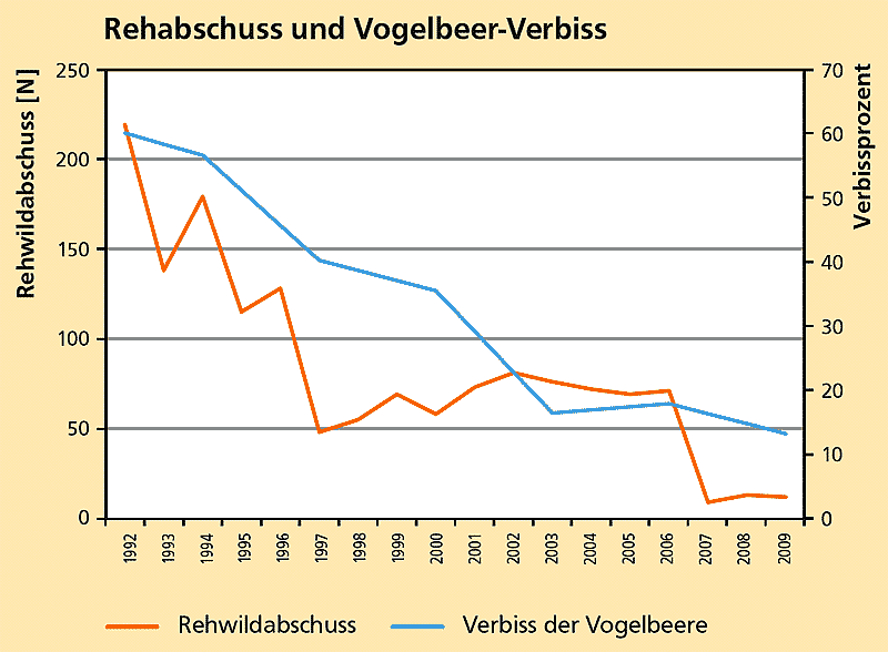 Der Rehabschuss wurde ausgehend von über 200 Tieren im Jahr 1992 kontinuierlich zurückgeführt und 2007 bis auf zehn Jährlinge für die Umweltprobenbank gänzlich eingestellt. Entgegen der Erwartungen ging parallel zur Abschussrücknahme auch der Leittriebverbiss bei der Vogelbeere von 60 auf aktuell 13 Prozent zurück (Abb. 5). Das lässt sich auf verschiedene Faktoren zurückführen. Mitte der 1990er Jahre vermehrte sich der Buchdrucker im Nationalpark Bayerischer Wald sehr stark. Dadurch entstanden Freiflächen, auf denen sich die Waldvegetation üppig entwickeln konnte. Aufgrund dieses reichhaltigen Nahrungsangebotes verminderte sich der Verbissdruck auf die Waldverjüngung. Gleichzeitig stieg die Verjüngungsdichte stark an. Daher konnten auch mehr Pflanzen verbissen werden, bis das gleiche Verbissprozent erreicht wurde.