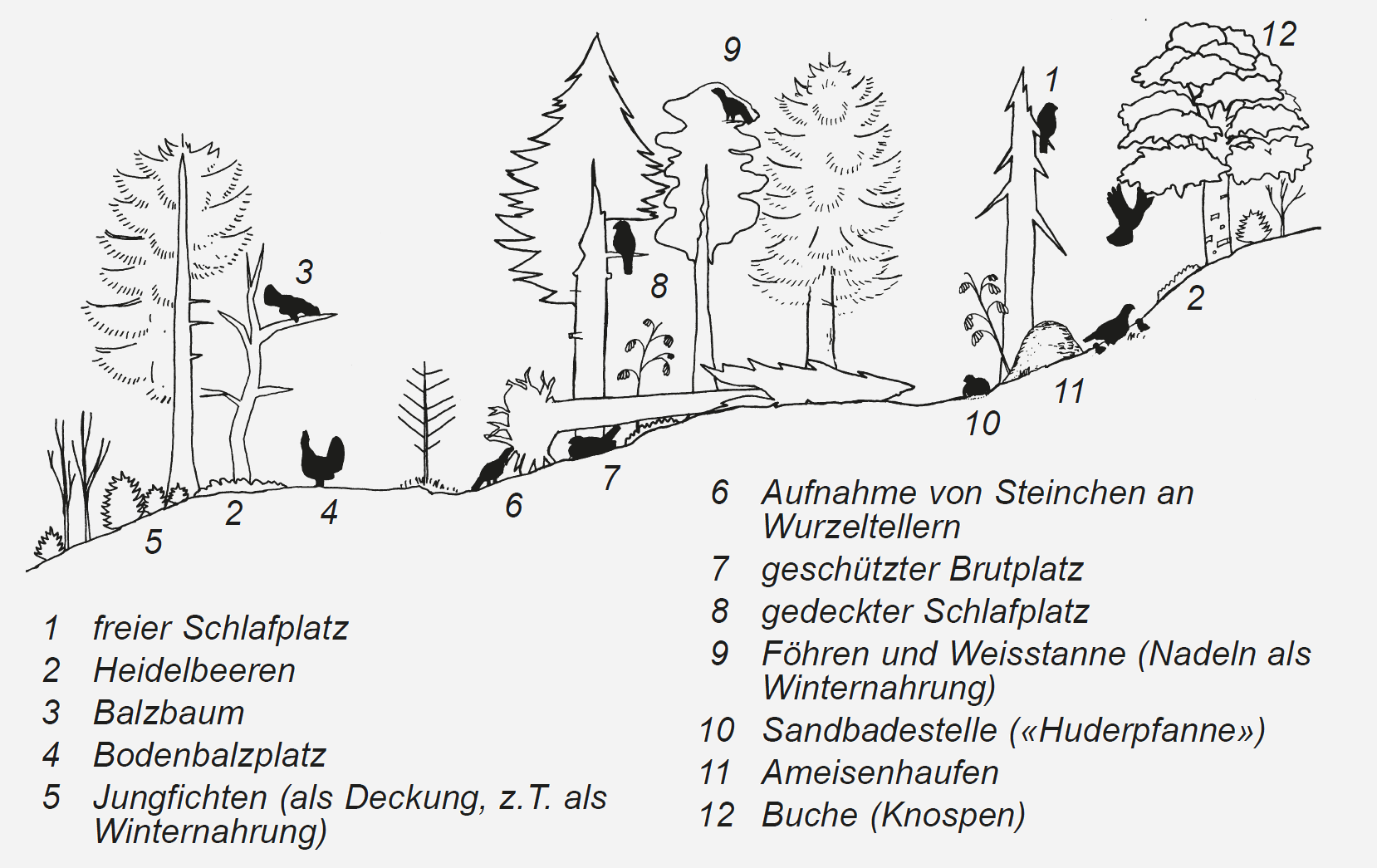 Weltweit kommen 18 verschiedene Raufusshuhnarten vor, in Mitteleuropa gibt es vier. Das Auerhuhn ist das grösste von allen. Als Lebensraum benötigt diese Art lichte, strukturreiche und ungestörte (Gebirgs-) Wälder mit einer gut entwickelten Krautschicht (Abb. 2 und 4). Hennen wie Hähne nutzen im Laufe eines Jahres ausgedehnte individuelle Streifgebiete, so dass nur grossflächig zusammenhängende und gut strukturierte Wälder überlebensfähige Populationen beherbergen können.