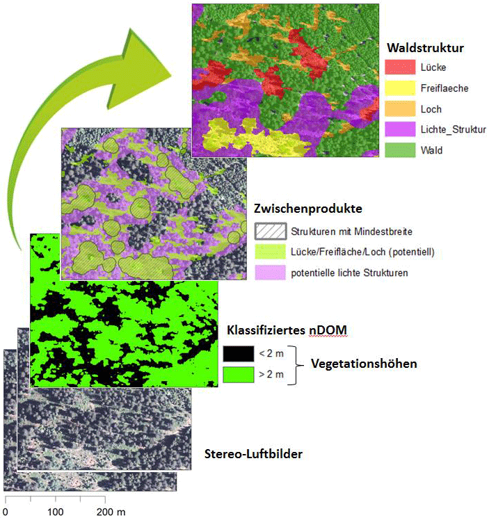 An der FVA wurde ein Verfahren entwickelt, um die für das Auerhuhn wichtigen Strukturen aus Luftbildern systematisch erfassen zu können. Das hierfür entwickelte Programm nennt sich "Auerhuhn-Tool". Grundlage des Auerhuhn-Tools sind die vom Landesamt für Geoinformation und Landentwicklung Baden-Württemberg für die gesamte Landesfläche im dreijährigen Turnus aufgenommenen digitalen Stereoluftbilder (aus den Jahren 2015 und 2016). Aus den überlappend vorliegenden Luftbildern können 3D-Punktwolken und daraus wiederum "Oberflächenmodelle" abgeleitet werden. Als Oberflächenmodell wird die Oberflächenstruktur der abgebildeten Landschaft bezeichnet. Wird nun die Geländehöhe vom Oberflächenmodelle abgezogen, erhält man ein Modell für Vegetationshöhen, das sogenannte „normalisierte digitale Oberflächenmodell“ (nDOM). Aus dem nDOM kann die Höhenstruktur von Waldflächen abgeleitet werden (Abb. 3).