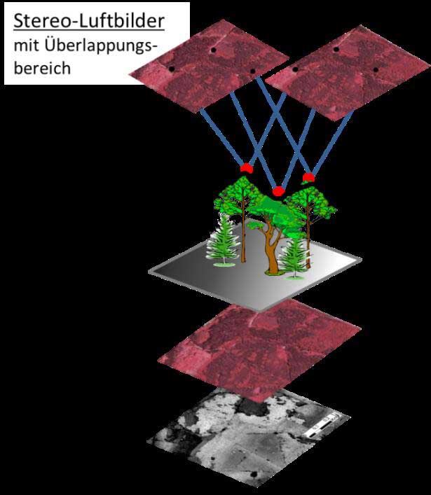 Abb. 3: Von den Stereo-Luftbildern zum normalisierten Oberflächenmodell. Durch überlappende Luftbilder können 3D-Punktwolken erzeugt werden. Aus diesen wird ein digitales Oberflächenmodell (DOM) berechnet. Subtrahiert man die Geländehöhe (DGM) vom Oberflächenmodell, erhält man das sogenannte normalisierte Oberflächenmodell (nDOM). Ein Orthophoto ist ein durch das Oberflächenmodell entzerrtes Luftbild. Quelle: FVA.