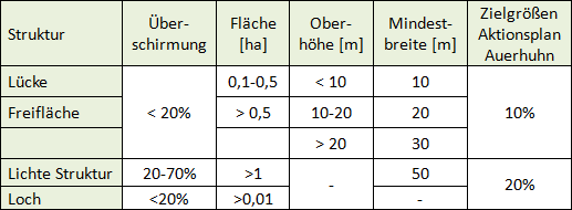 In Annäherung an die Vorgaben des Aktionsplan Auerhuhn, wurden von der Arbeitsgruppe die vier Strukturelemente "Lücke"“, "Freifläche", "Lichte Struktur" und "Loch" definiert. Die Herleitung dieser Strukturen ist in Tabelle 1 abgebildet. Ist bekannt, wieviel dieser Strukturen aktuell vorhanden sind (=Ist-Zustand), können Umsetzungsmöglichkeiten erarbeitet und bewertet werden, um den definierten Soll-Zustand zu erreichen. Aus diesem Soll-Ist-Vergleich lassen sich konkrete Vorgaben für die Umsetzung auf jeder Teilfläche ableiten.