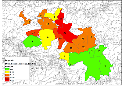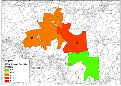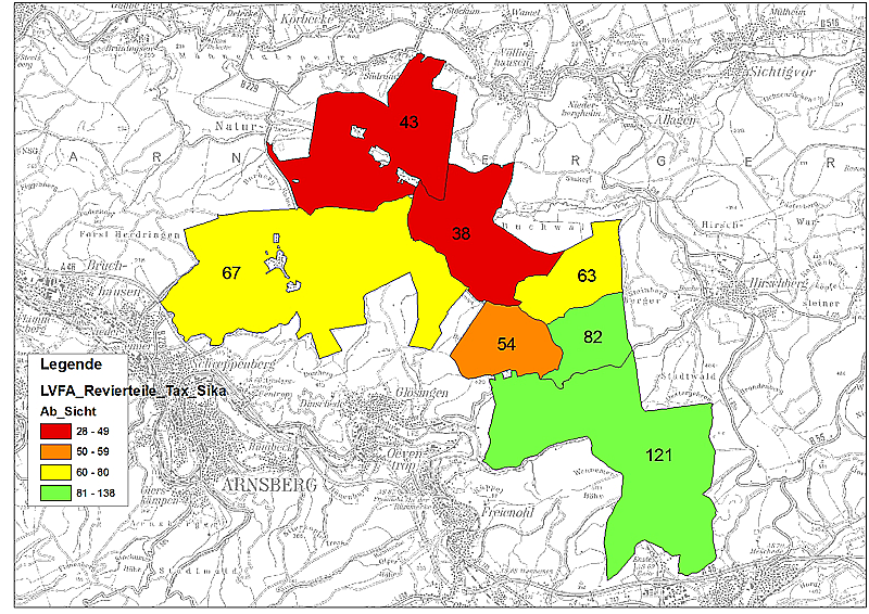 Für das LVR Hirschberg war in diesem Zusammenhang auch eine genauere Betrachtung einzelner Revierteile möglich. Rot dargestellt sind Flächen, auf denen der Abschuss unter 50 % der gezählten Stücke liegt. Klar ist, dass das Wild verglichen mit dem Zeitpunkt der Zählung zur Jagdzeit nicht zahlenmäßig gleich in den einzelnen Revierteilen vorkommt. Revierteile mit im Frühjahr ausgesprochen attraktiven Flächen weisen zur Jagdzeit teilweise deutlich geringere Wilddichten auf. Umso wichtiger ist es, die Bestandsermittlung auf der gesamten Fläche des Sikaverbreitungsgebietes durchzuführen und die notwendigen Abschüsse auf dieser Grundlage zu berechnen.