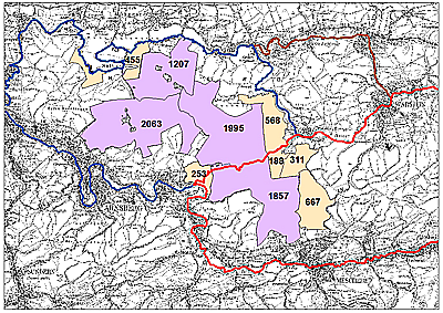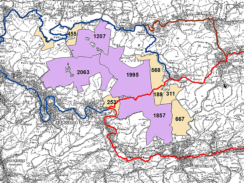 Nach einer Information an die Hegegemeinschaft konnten weitere fünf Reviere für eine Taxation und Auswertung der Daten gewonnen werden. Die Abbildung 2 zeigt den EJB Schmalenau (violett )und die weiteren teilnehmenden Reviere. Die Reviere südlich der roten Linie liegen außerhalb des ehemaligen Sikawildbewirtschaftungsbezirks und sind somit seit 1995 Freigebiet. Mit Inkrafttreten der Verordnung war hier jedes Stück Sikawild zu erlegen, auch Hirsche. Ein Abschussplan musste nicht erstellt werden. Der ehemalige Sikawildbewirtschaftungsbezirk umfasst die in der Karte blau (auch Rotwildbewirtschaftungsbezirk) und braun (Rotwildfreigebiet) umrandeten Flächen. Rot und blau begrenzt ist der Rotwildbewirtschaftungsbezirk.
