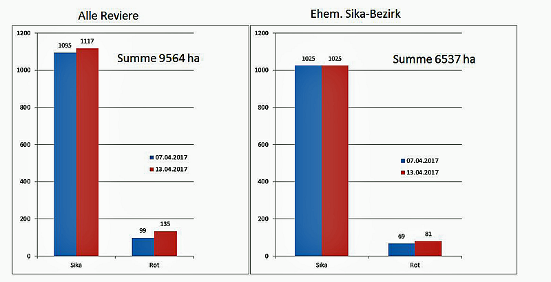 In allen Revieren wurden am 7. und 13. April 2017 im Vorfeld festgelegte Routen befahren. Die Fahrzeuge waren in der Regel mit vier Personen besetzt. Die Fahrstrecke betrug zwischen 50 und 100 km. Gezählt wurden auf einer Gesamtfläche (siehe Abbildung 2) von ca. 9.500 ha 1.117 Stück Sikawild; bezogen auf die Flächenanteile des Bewirtschaftungsbezirks entspricht dies 1.025 Stück auf 6.500 ha (Abb. 3).