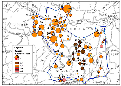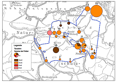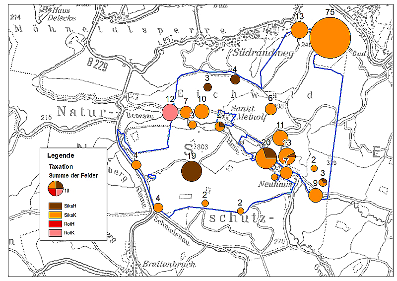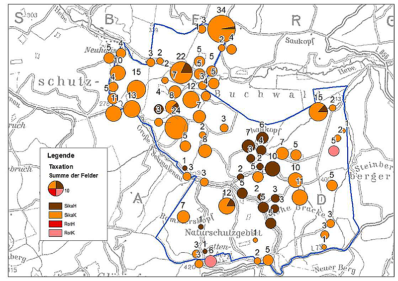 Bekannt war die räumlich sehr unterschiedliche Verteilung des Sikawildes. Die Taxation hat dies bestätigt. Bezogen auf die reine Jagdfläche des EJB Schmalenau ergab sich eine durchschnittliche Sichtung von 13 Stück Sikawild auf 100 ha.