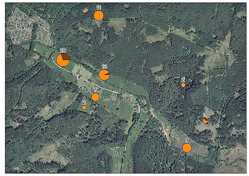 Die Daten wurden zur Analyse der Verbreitung kartografisch aufbereitet, um die Verteilung des Wildes festzustellen. In Abb. 4 ist die Karte des LVR Himmelpforten dargestellt. Obwohl auf einer Revierfläche von 1.200 ha 65 km Wegenetz befahren wurde, gibt es deutliche Schwerpunkte der Sichtungen. Ein Blick auf das Luftbild zeigt, dass das Sikawild sich so verhält, wie erwartet: Zum gewählten Zeitpunkt im Erstfrühling (Buschwindröschenblüte) entwickelt sich in den Offenlandbereichen die Grünäsung und genau dorthin zieht das Wild (Abb. 5).