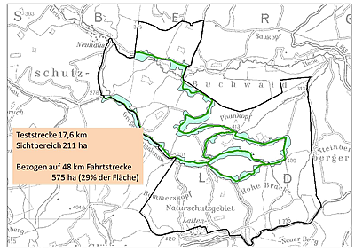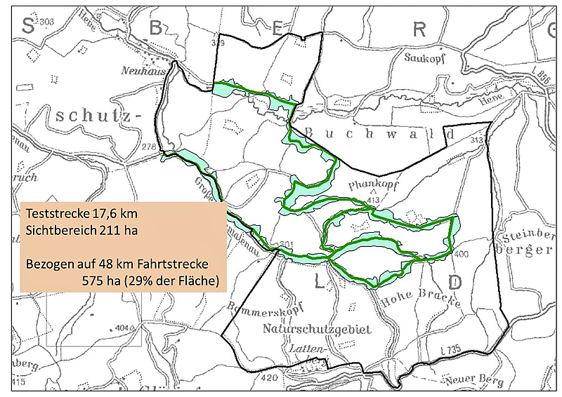 Um zu herauszufinden, wie viel Fläche absolut eingesehen werden kann, wurde hierzu im LVR Hirschberg tagsüber eine Testfahrt von 17,6 km unternommen. Während der Fahrt wurde der einsehbare Bereich rechts und links des Weges dokumentiert. Unter den Verhältnissen des LVR Hirschberg können demnach bei einer Fahrtstrecke von 48 km 575 ha oder 29 % der Revierfläche direkt eingesehen werden. Bei einer erneuten Nachtfahrt auf der Teststrecke zeigte sich, dass sich die nun taxierbaren Entfernungen teilweise von den tagsüber ermittelten Werten unterscheiden. Unter anderem erscheint höherer, tagsüber kaum störender Bewuchs an den Wegesrändern unter dem hellen Scheinwerferlicht als weiße "Leinwand". Auch Reflexionen durch den Baumbestand führen zu einer geringer einsehbaren Fläche. Andererseits ist in den Kyrill-Kahlflächen mit ausgedehnter Birkenvegetation tagsüber kaum ein Stück Wild auszumachen. Reflexionen der Augen ergeben nachts zumindest einen kleinen Beitrag zum Gesamtbestand.