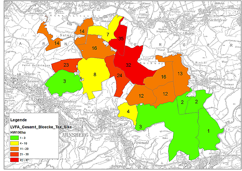 Betrachtet man die dazu gehörigen Staatswaldreviere einzeln (Abb. 8), ergibt sich ein völlig anderes Bild: Während im Revier Lattenberg (seit 1995 im Freigebiet!) lediglich drei Stück Sikawild auf 100 ha gesehen wurden, zählte man im LVR Hirschberg 21 Stück pro 100 ha. Aber auch innerhalb der bis 2.000 ha großen Staatswaldreviere gibt es deutliche Unterschiede. Daher wurden die Reviere in Blöcke eingeteilt und genauer betrachtet. Hierbei kristallisierte sich ein deutlicher Schwerpunkt östlich der Ortschaft Neuhaus heraus, teilweise in der Nähe des ursprünglichen Gatters. Abbildung 9 mit den Nachbarrevieren zeigt schlüssig, dass es regionale, Revier übergreifende Schwerpunkte gibt.