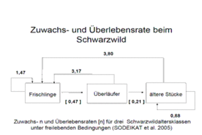 Die Zuwachsdynamik des Schwarzwildes (Abb. 5) wird unter naturnahen Bedingungen vor allem durch den Wechsel von Mastjahren und Fehlmastjahren bestimmt: In Lebensräumen mit potenzieller Mast ist die Frischlingsquote nach Mastjahren um etwa 60 % höher als nach Fehlmastjahren. In Lebensräumen ohne Baummast sind die Zuwachsraten generell niedriger. Dies belegt die hohe Verantwortung der Jäger auch für die Bestandszunahme von Schwarzwild: Ablenkungsfütterungen machen nur Sinn in großen Waldgebieten für die Zeit, in der die Sauen im Feld zu Schaden gehen. Ablenkungsfütterungen sollen das Schwarzwild im Wald binden und lange beschäftigen, dürfen jedoch energetisch keinen wesentlichen Anteil zur Ernährung des Bestandes leisten, wenn sie nicht das gesamte Zuwachsgefüge durcheinander werfen sollen.