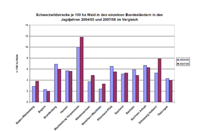 Ein bundesweiter Vergleich der Strecken macht deutlich, dass NRW im Vergleich zu den Nachbarländern mit deutlich längeren Jagdzeiten für die Überläufer oder auch ausgewachsenen Sauen die geringste Dichte aufweist (Abb. 7). Eine generelle Freigabe mit Ausnahme führender Stücke führt eher dazu, dass die Schwarzwildbestände zunehmen. Wer Überläufer jagen darf, erlegt im Zweifel lieber den "lohnenden" Überläufer als den Frischling. Eine zu geringe Frischlingsbejagung fördert jedoch das Anwachsen der Bestände, da damit auch der Beitrag der Frischlinge zum Zuwachs steigt.