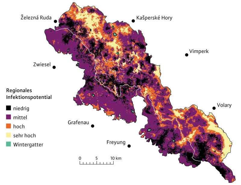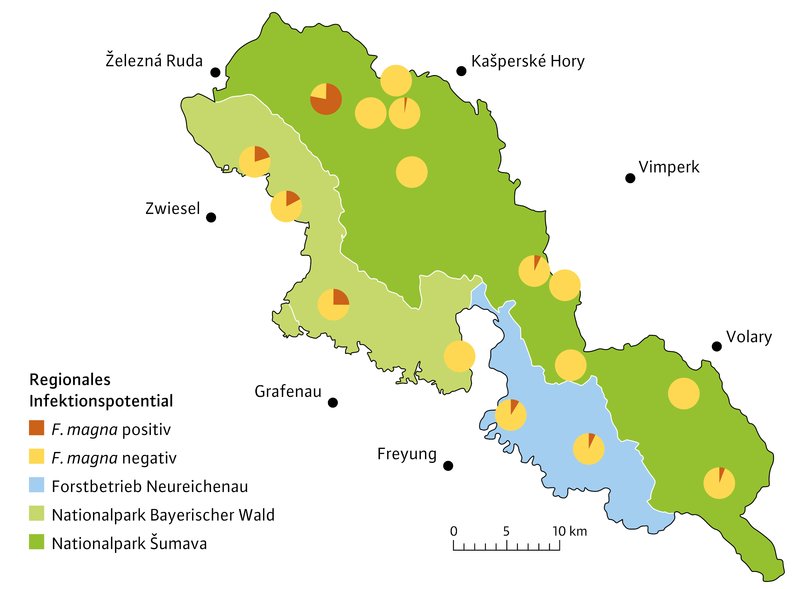 Im Rahmen des INTERREG-Projekts wurde die Befallssituation von Rot-, Reh- und Schwarzwild mit dem invasiven Parasiten "Großer Amerikanischer Leberegel (GAL)" im Böhmerwald-Ökosystem erfasst. Die modellierten Verbreitungskarten der Zwischen-, End- und Fehlwirte erlaubten nun die Lokalisierung von Infektionshotspots für End- und Fehlwirte. Um die Verbreitung des GAL im Projektgebiet abzuschätzen, wurden Losungsproben aus 16 Wintergattern untersucht – in neun Gattern wurde der GAL nachgewiesen. Die Untersuchung von Wildtierlebern ergaben für Rotwild Infektionsraten zwischen rund 12 und 18 %. Reh- und Schwarzwild spielen für das aktuelle Infektionsgeschenen keine Rolle. Eine Möglichkeit, das Infektionsgeschehen positiv zu beeinflussen, besteht in der Schließung der Rotwild-Wintergatter über den Sommer. Ein weiterführendes Monitoring sollte angestrebt werden.