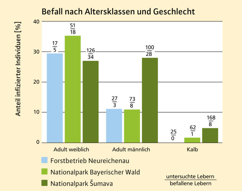 Als zweite Methode diente die Untesuchung der Lebern von erlegtem Rot-, Reh- und Schwarzwild im Jagdjahr 2021/22. Mit Hilfe dieser Methode war es möglich, einen fortgeschrittenen Befall sicher zu diagnostizieren. Die Infektionsrate beim Rotwild aller Altersklassen war mit fast 17,8 % im Nationalpark Šumava am höchsten (Abbildung 5). Im Nationalpark Bayerischer Wald und im Forstbetrieb Neureichenau waren die Infektionsraten mit knapp 14,5 % und 12,4 % etwas geringer. Männliche Tiere waren hier seltener infiziert als weibliche, was eventuell auf Unterschiede im Raumnutzungsverhalten zurückzuführen ist. Mit zunehmendem Alter nahm der Anteil infizierter Rotwild-Individuen zu. Die höchste Befallsrate wiesen mit knapp 35,3 % die weiblichen adulten Individuen aus dem Nationalpark Bayerischer Wald auf. Bei Rotwild-Kälbern ließ sich ein Befall lediglich vereinzelt nachweisen. Lebern von Reh und Wildschwein wurden nur im Nationalpark Šumava und im Forstbetrieb Neureichenau beprobt. Lediglich bei einer der 155 untersuchten Rehlebern wurde ein Befall diagnostiziert. Von den 482 untersuchten Wildschweinlebern war keine befallen.