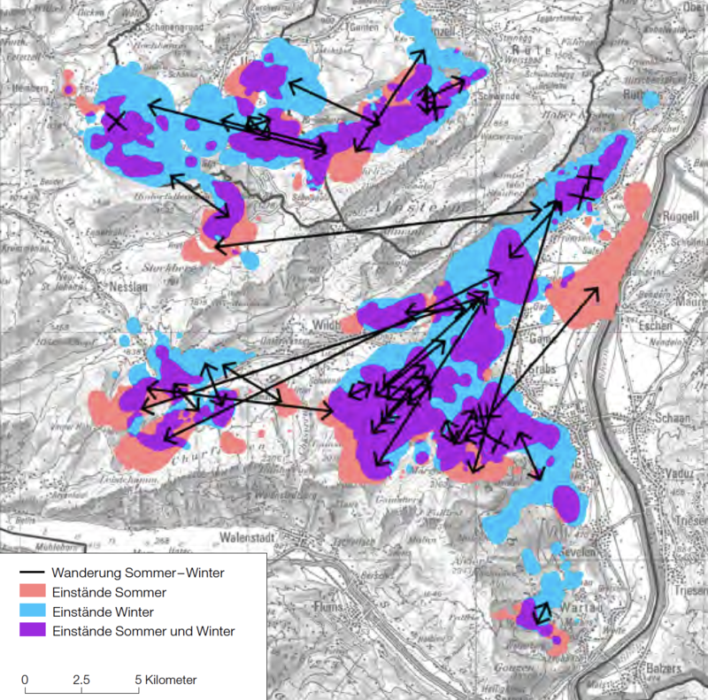 Die erhaltenen GPS-Positionen waren die Datengrundlage, um die individuellen Winter- und Sommereinstände zu berechnen und allfällige überregionale Wanderungen der Rothirsche aufzuzeigen.
