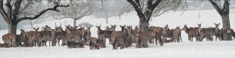 Abb. 3 – Rothirschrudel im Winter in einer Tallage. Foto: Peter Eggenberger