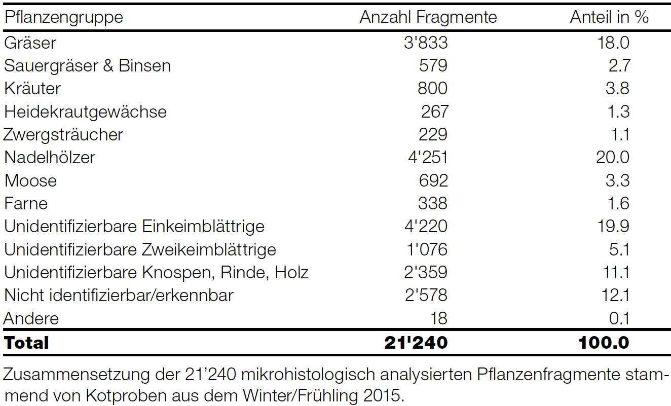 Zwischen Januar und April 2015 und 2016 wurden 345 Kotproben analysiert. Dabei zeigte sich, dass sich die Rothirsche zwischen Winter und Frühling vor allem von Nadelhölzern (20%) und Gräsern (18%) ernährten. Daneben noch von Sauergräsern, Binsen, Kräutern und Moosen (zus. ca. 10%). 11% bestanden aus verholzten Pflanzenteilen. Ende Januar/Anfang Februar 2015 war der Anteil von Nadelholzfragmenten sehr hoch, wogegen er anschliessend abnahm und der Anteil an Gräsern zunahm.